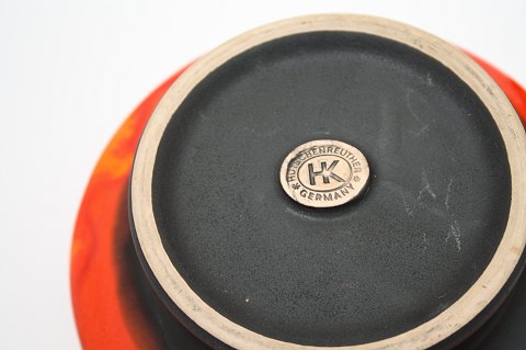 T.v. Flad rund vase orange glasur, sort mat glasur i bund. Hutschenreuter (HK). Højde 10,5 cm. Midterste diameter 15 cm. Pris: 450 kr.
