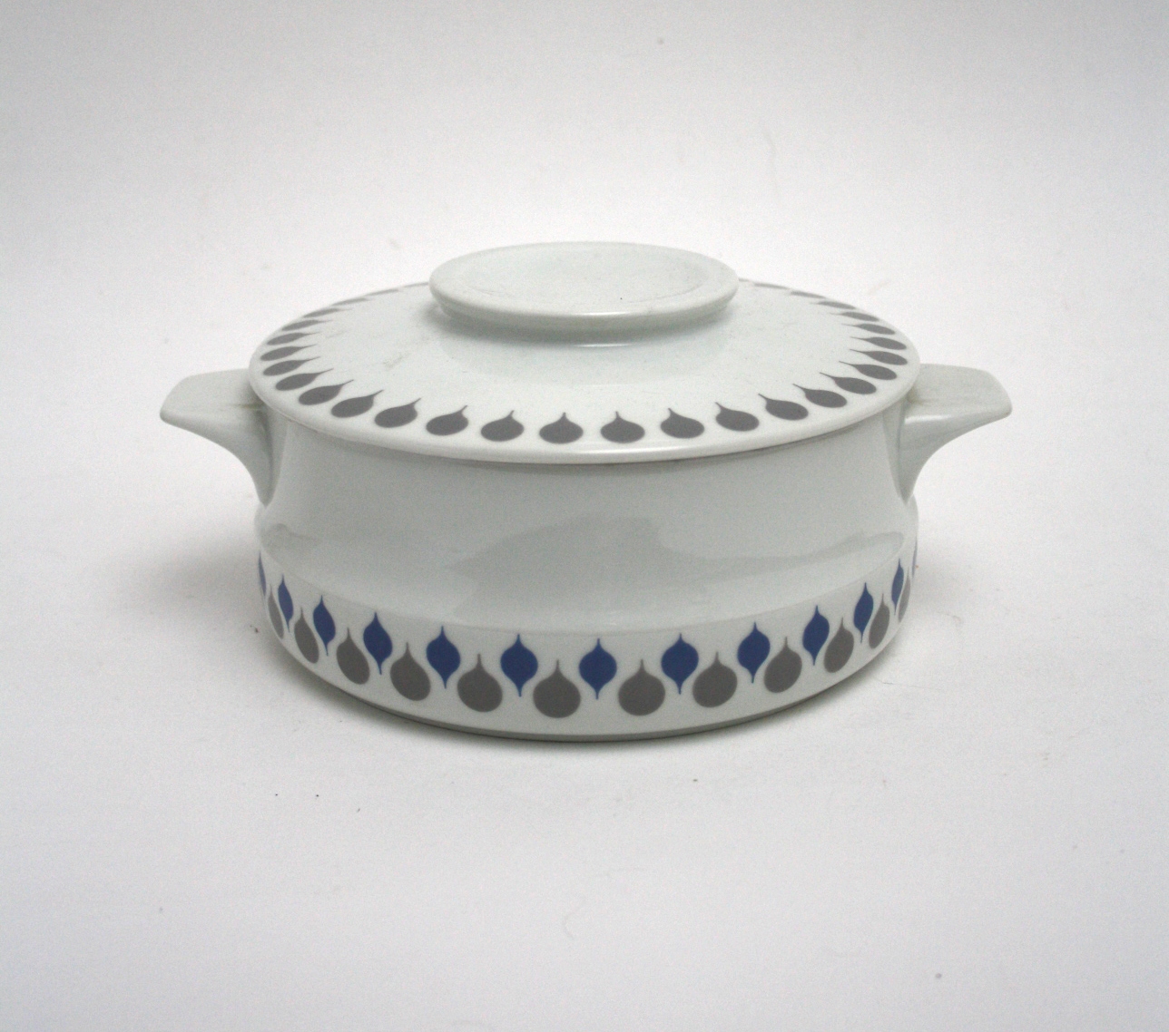 Lyngby porcelænsfabrik, Danild 66 designet af Axel Brüel. Skål med ører og låg. Højde 11 cm. Diameter med ører 25 cm. Perfekt stand. Pris: SOLGT
