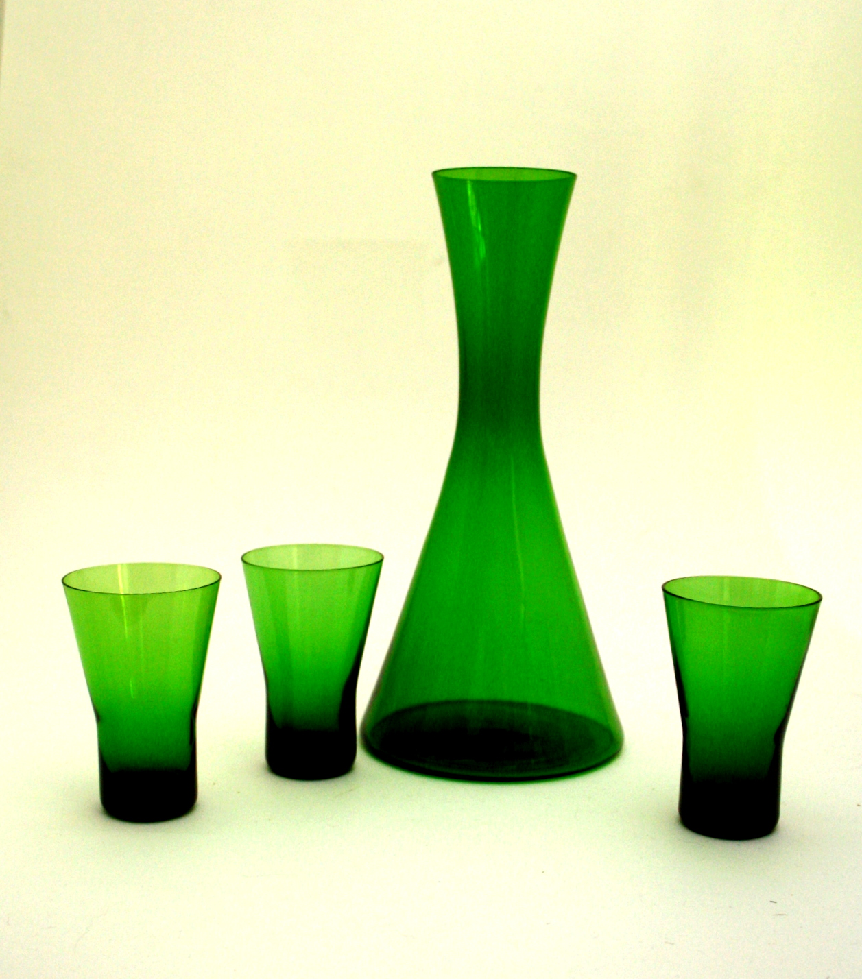 Holmegaard, Winston ædelgrønt glas, designet af Per Lütken produceret i perioden 1956 til 1965. Lille aperitif glas. Højde 9 cm. Øverste diameter 5,5 cm. solgt Fogliet, højde 24 cm. Nederste diameter 11 cm. pris solgt