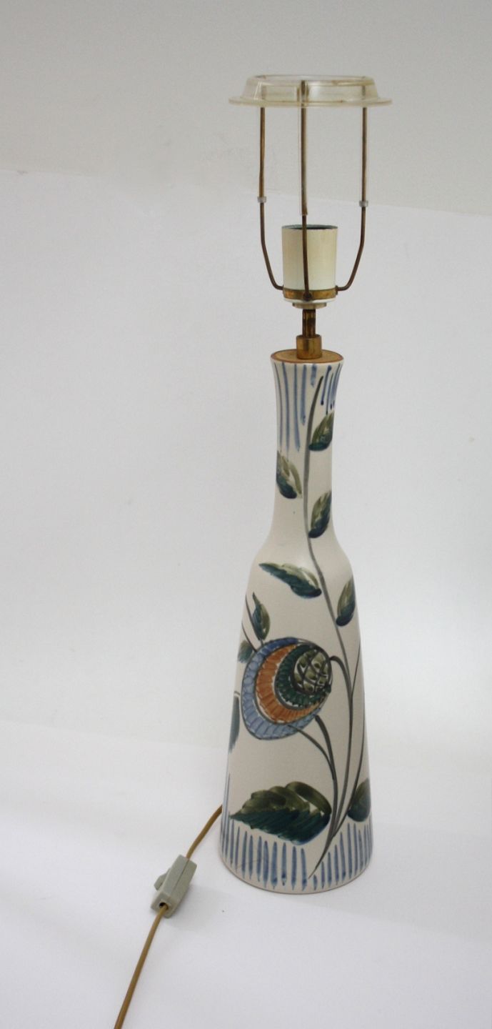 Aksini, Bordlampe designet af Aksel Sigvald Nielsen (1910 - 1989), uddannet håndværksmaler i Holbæk i 1929, ansat hos Knapstrup. Hvid lampe med motiver. Højde 52 cm. incl. fatning. Vægt 5 kg. Pris: SOLGT