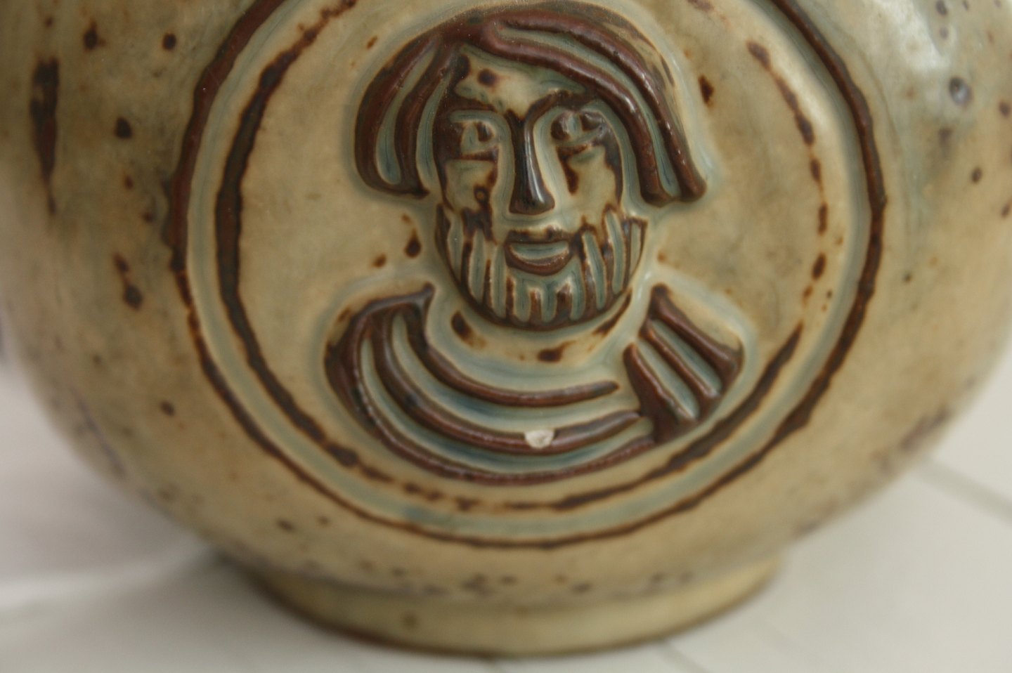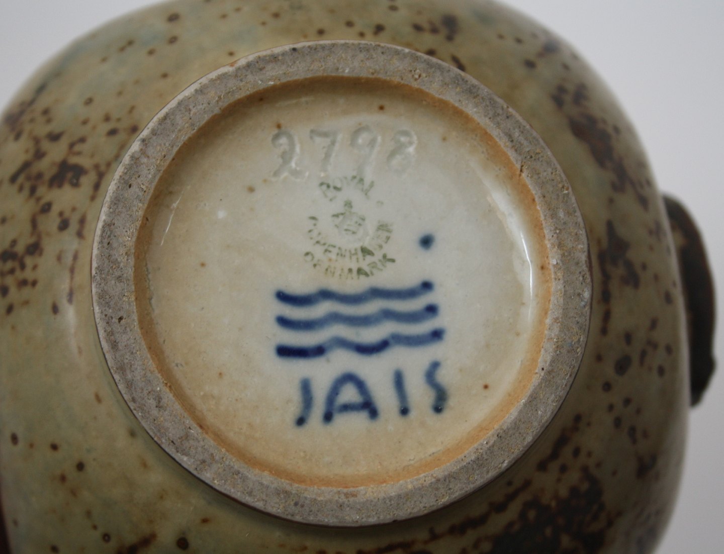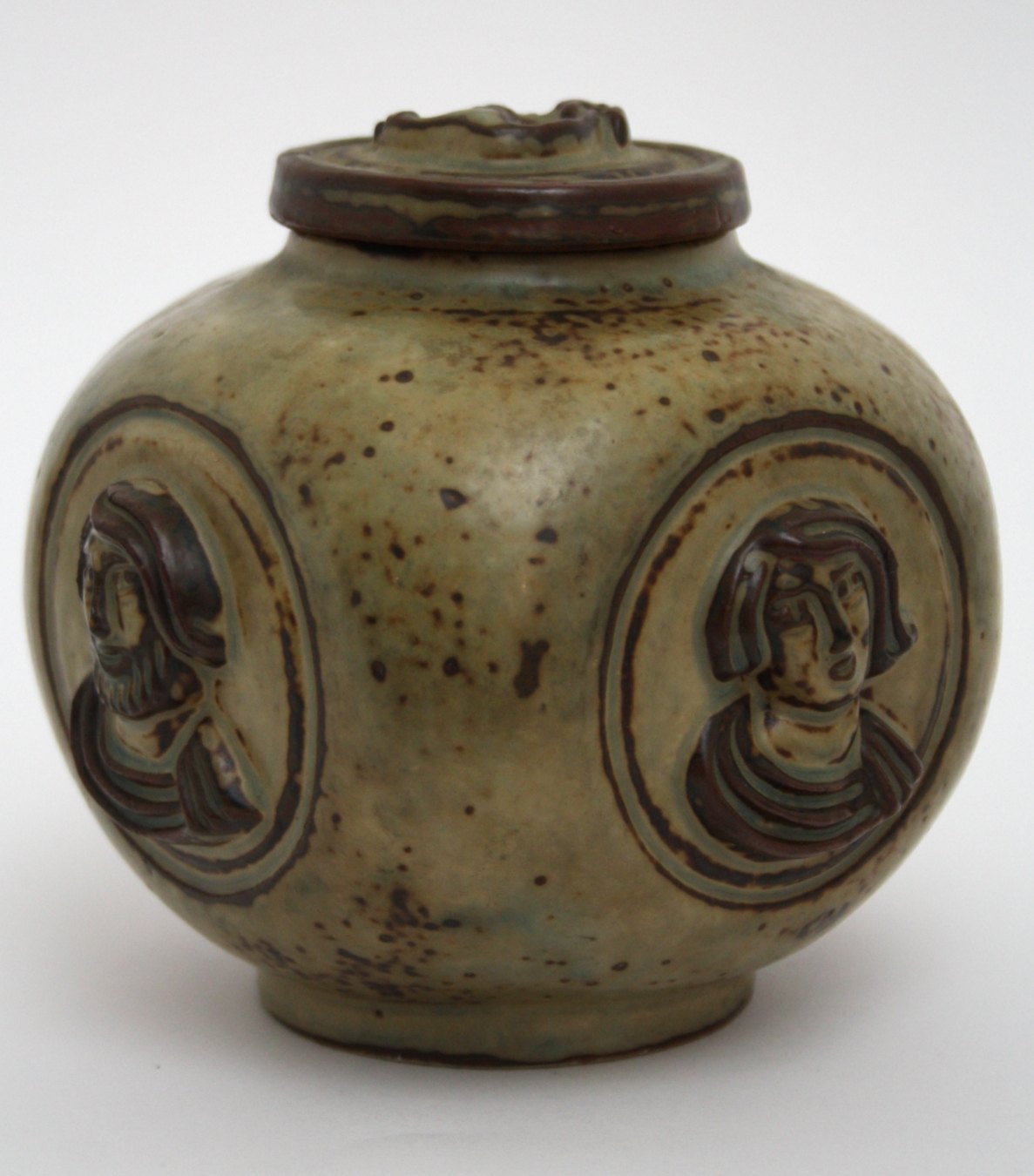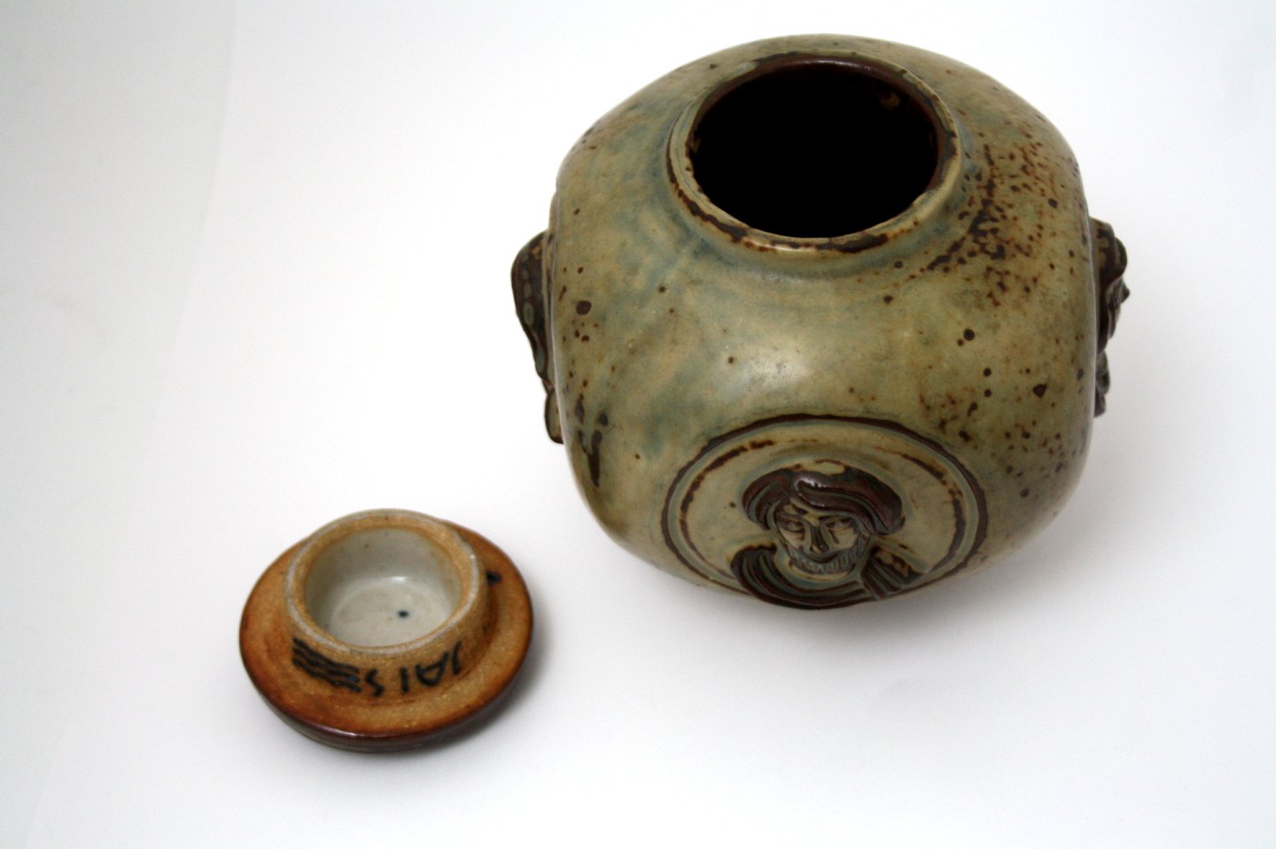 Royal Copenhagen, Lågkrukke i stentøj designet af Jais Nielsen. Motiver af kvindeansigter og mandeansigter. På låget motiv af kat. Signeret JAIS. Formnr. 2798. I. sortering. Afslag på den ene af motiverne se ekstra foto. Højde 13,5 cm. Diameter 14 cm. Pris: 1500 kr.