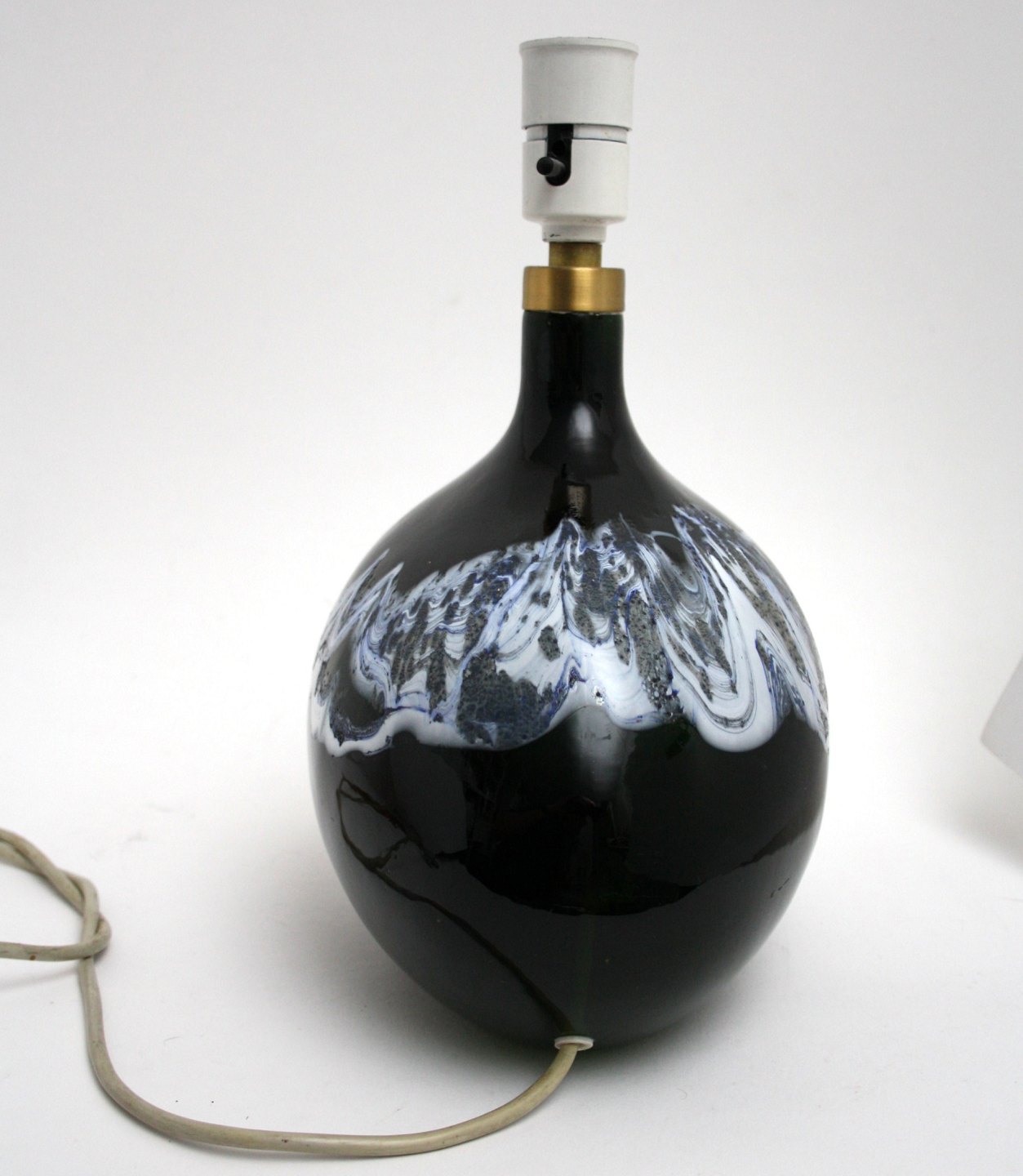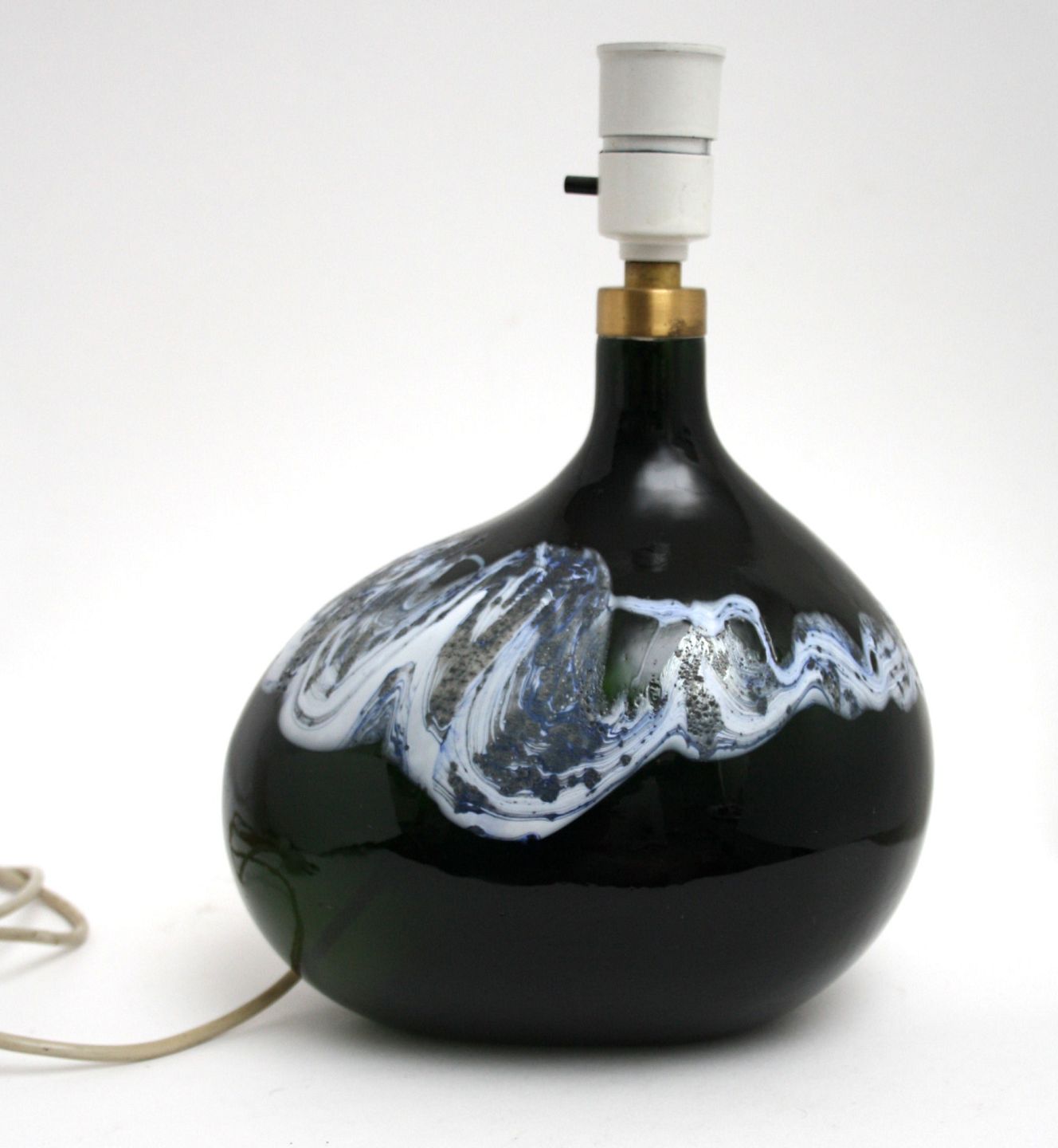 Holmegaard, Lamp art Asymetrisk lampe i mørkegrøn med hvid dekoration, designet af Michael Bang i 1973, udgår af produktion i 1976.