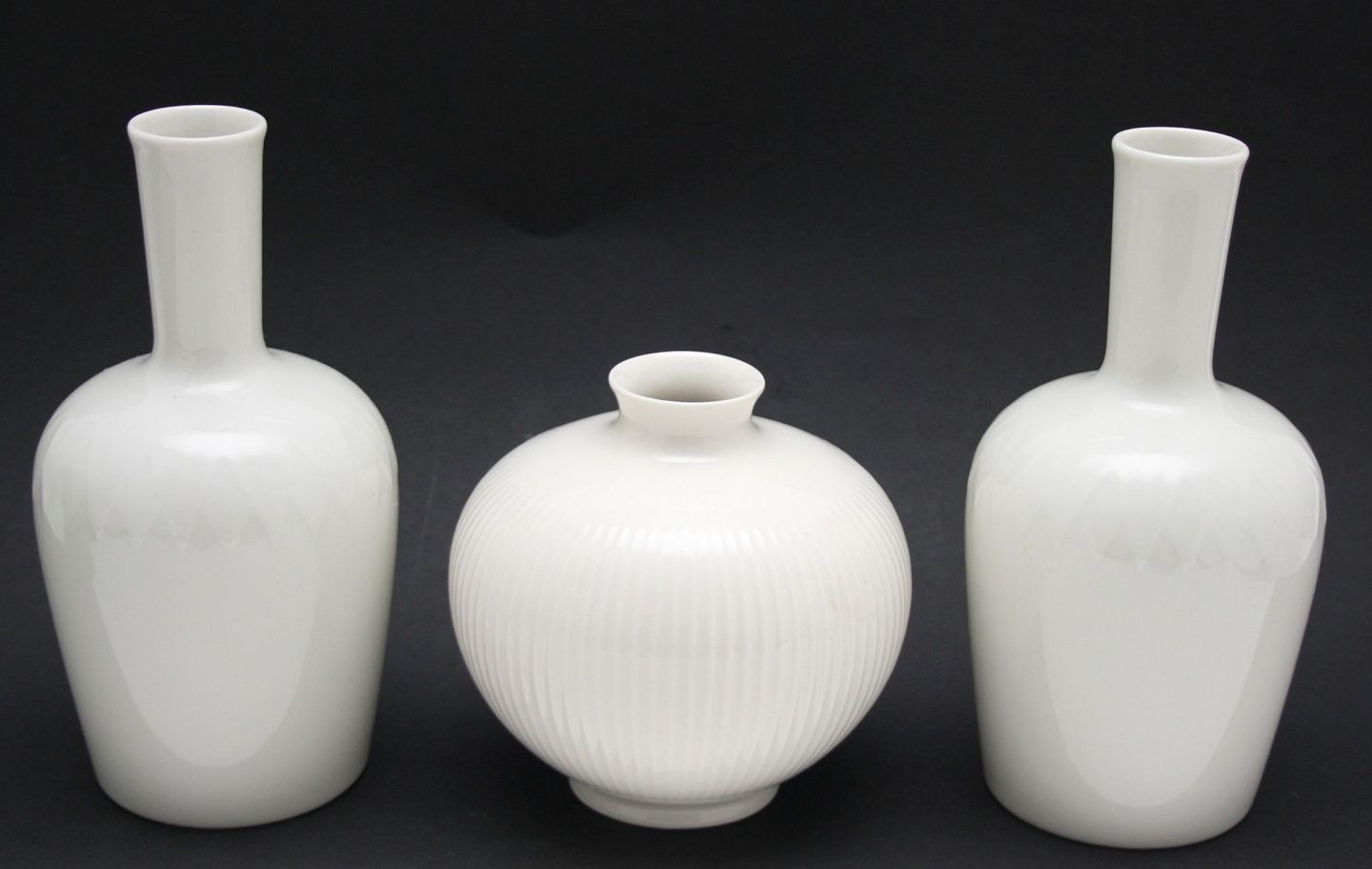 T.v. og t.h. Vase med motiv på kraven. Formnr. 3599. Højde 16,5 cm. I. sortering. Pris: 275 kr. stk. Lager: 1