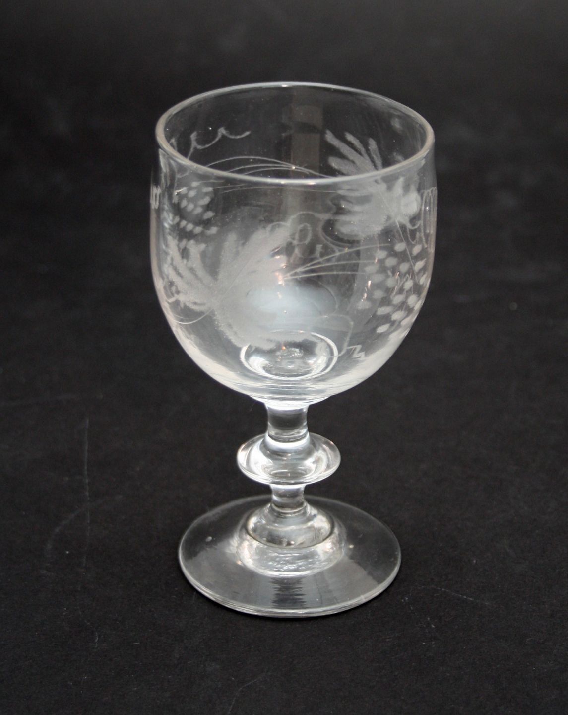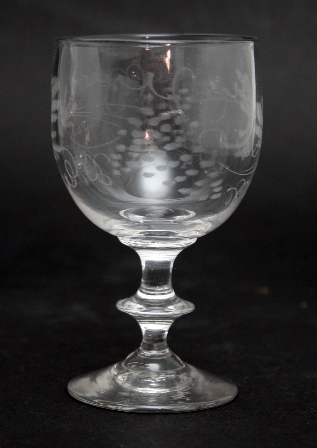 Aalborg glasværk, Vinløv glas består af 2 tredelte ret kraftige femfligede blade. 2 drueklaser drejer nedad til højre og udgør 25-40 druer i forskellig fordeling. Klatretråde over og under klaserne. Indvendig lille fejl i kummen. Højde 10,5 cm. Diameter 6 cm. Knækket i bund. Pris: solgt