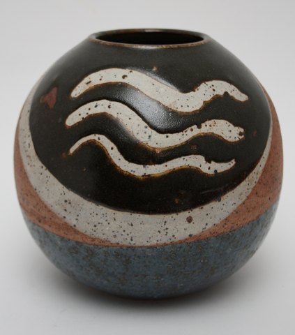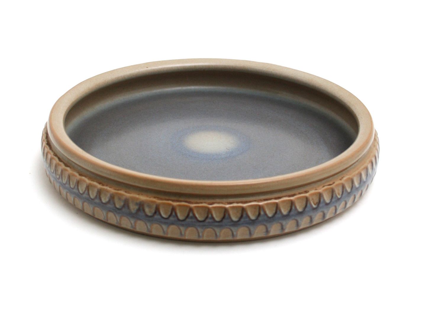 Knabstrup, Stort rundt fad i douche farver lys blå og beige designet af Günter Praschak ca 1967. Diameter 28 cm. Højde 5 cm. Flot stand. Pris: SOLGT