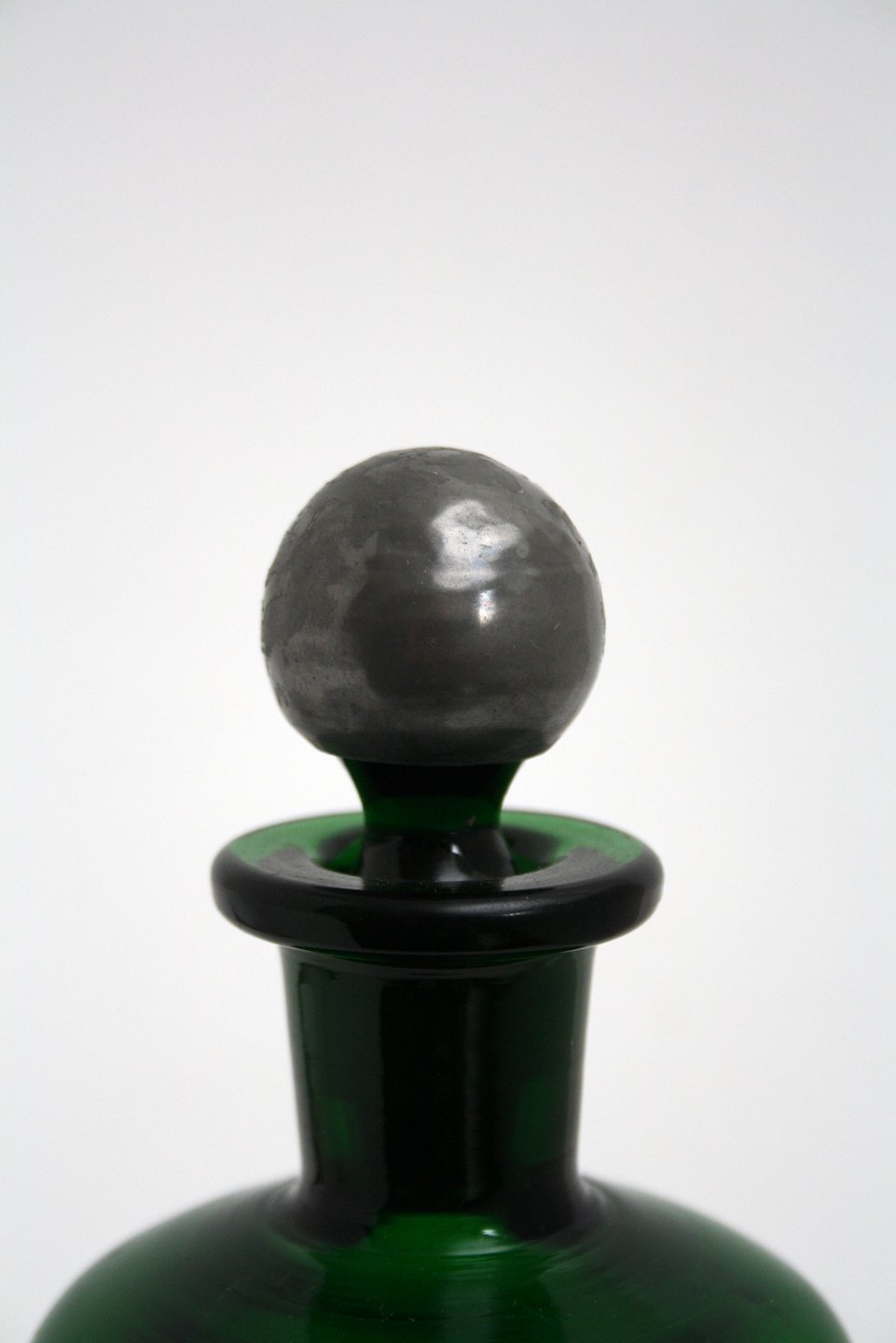 Holmegaard, Grøn klukflaske med tin prop. Højde 27,5 cm. Pris: SOLGT