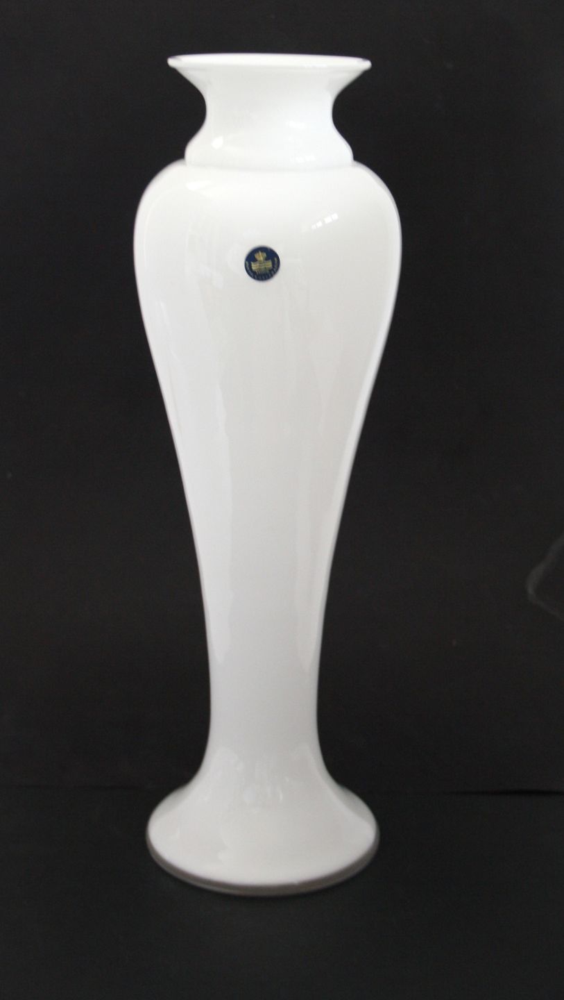 Royal Copenhagen, Holmegaard Glasværk, Korinth høj slank vase i opalhvid med klart krystal overfang. Designet af Anne Grete Halling-Koch i 1997. Højde 40 cm. Øverste diameter 9,5 cm. Pris: solgt
