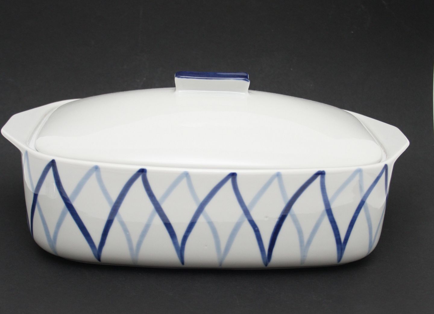 Harlekin/Blå flamme Dan-ild Lyngby. Design Axel Brüel i 1958. Ildfast porcelæn blev solgt under sloganet fra ild til bord.