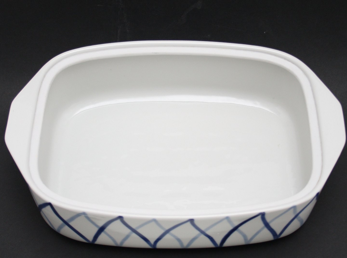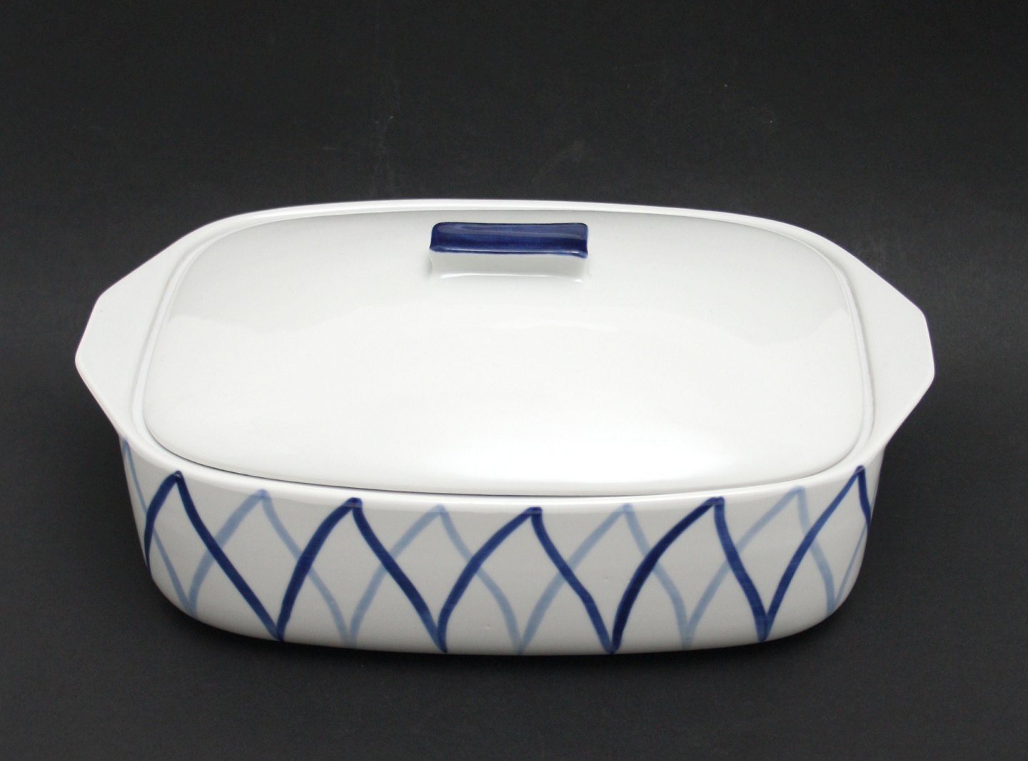 Ildfast lågfad. Længde 29 cm. Bredde 18,5 cm. Højde uden låg 7,5 cm. Pæn stand. Pris: SOLGT