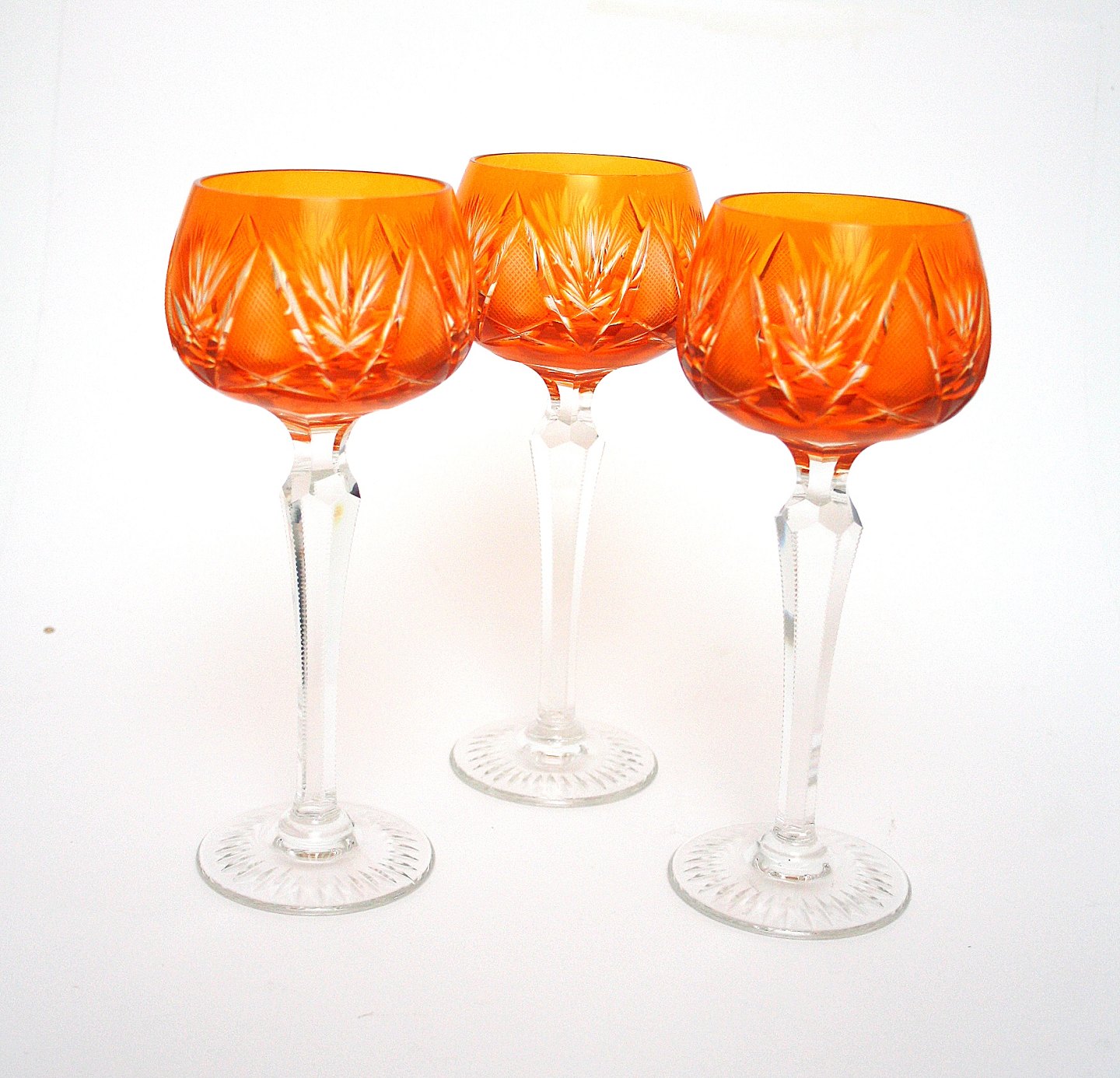 Bøhmisk krystal, Orange vinglas med slibninger på kumme og stilk. Højde 19,5 cm. Pris: SOLGT