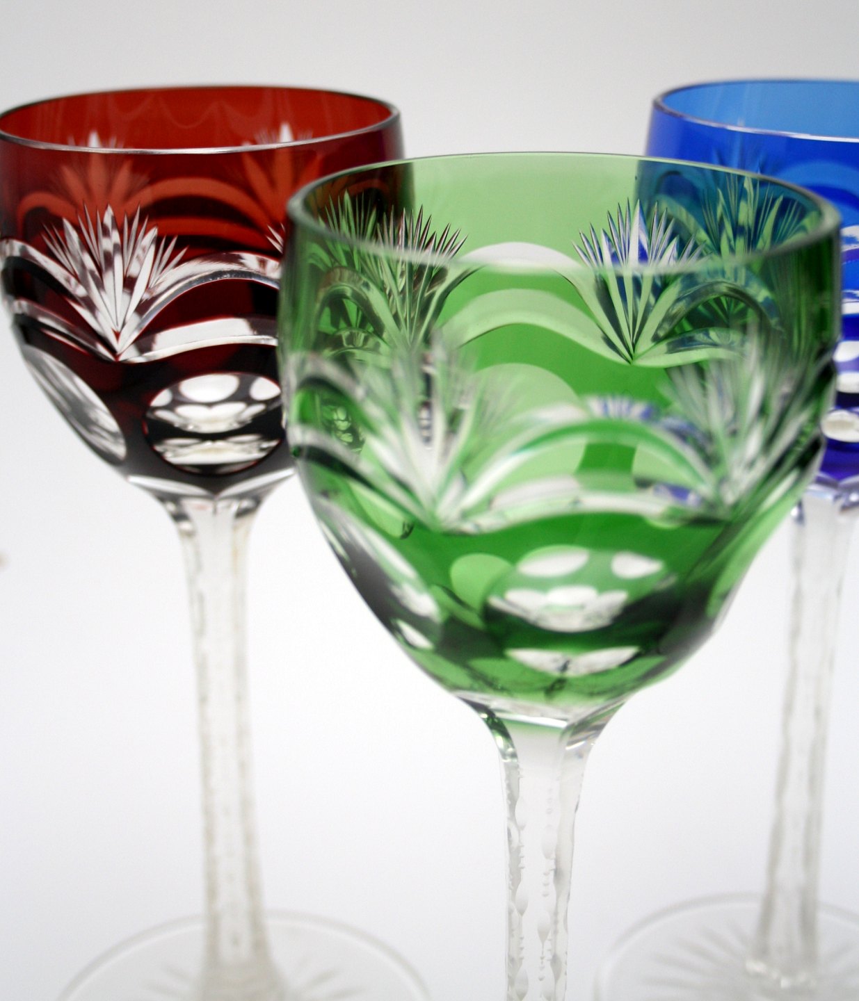 Bøhmisk krystal, Vinglas med slibninger på kumme og stilk. Højde 20,5 cm. Øverste diameter 7,5 cm.Pris: 225 kr. stk.