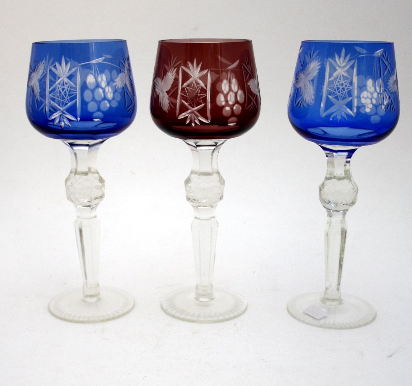 Bøhmisk krystal, Vinglas i flere farver. Kumme med druer, blade og stjerner. Slebet stilk. Højde 21,5 cm. Pris: 250 kr. stk.