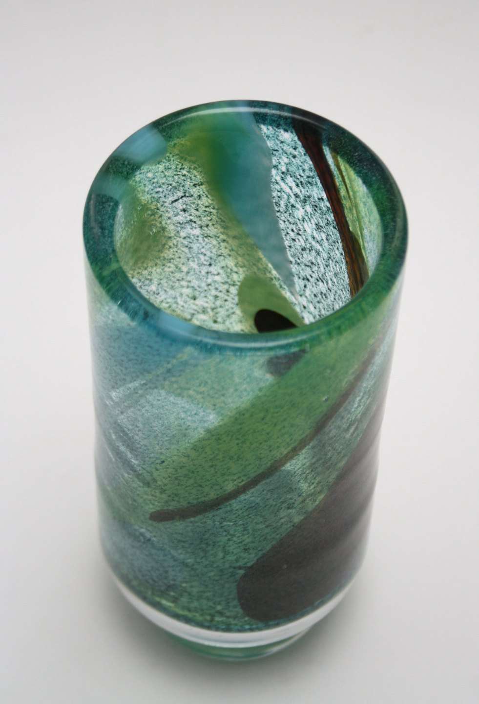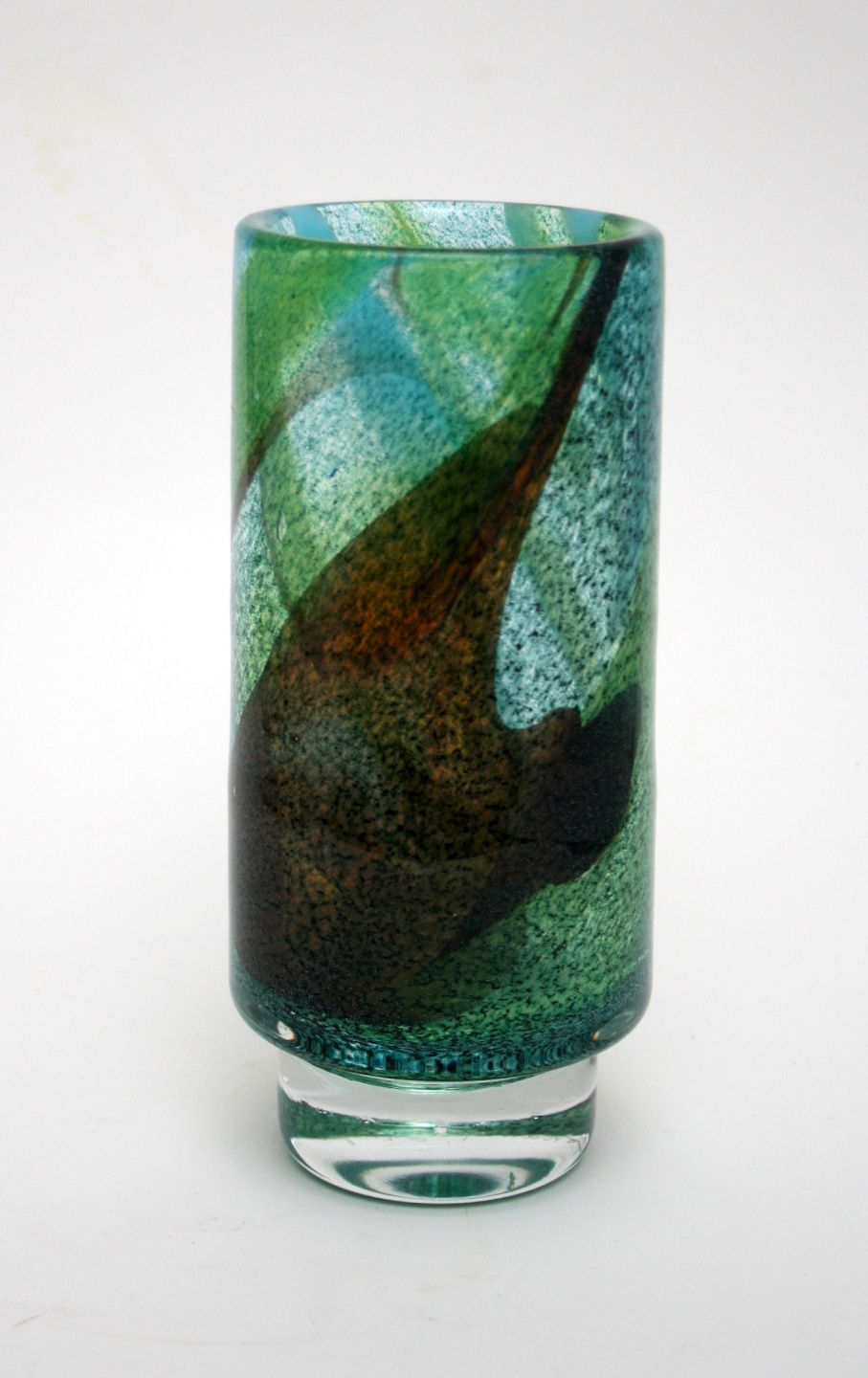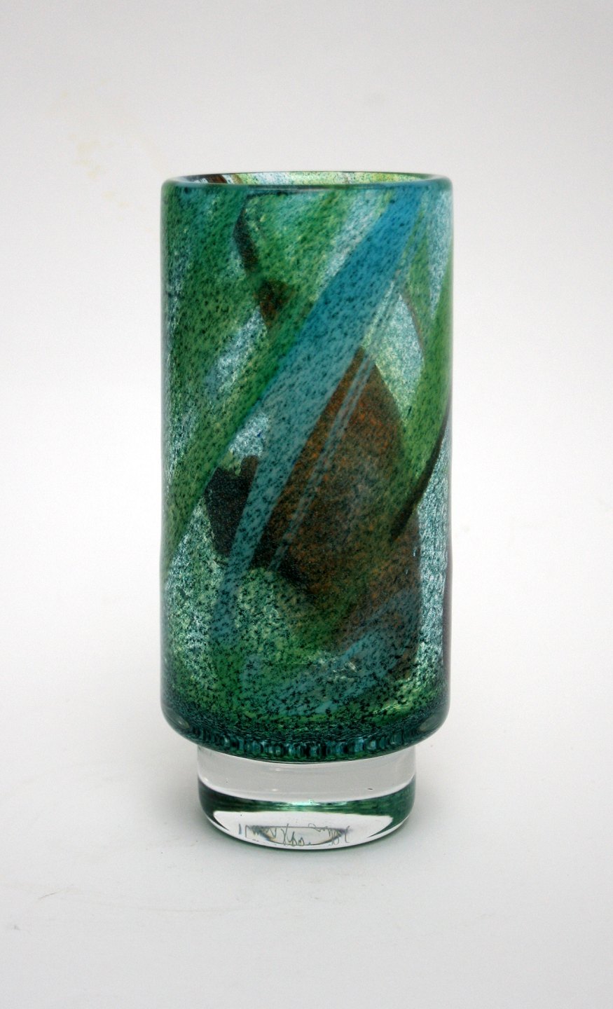 Johansfors glasværk, Sverige, Cylinderforvet vase på fod fra serien Spontana designet af Bengt Orup 1967, signeret Orup Johansfors. Højde 18,5 cm. Fin og hel stand. Pris: SOLGT