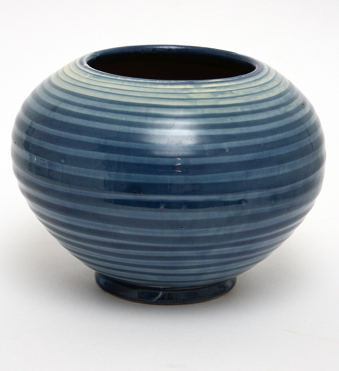 Kähler, smuk rund stribet vase i blålige nuancer og cremet glasur. Signeret HAK Denmark. Højde 11 cm. Største diameter 14 cm. Flot stand. Pris: 1850 kr.
