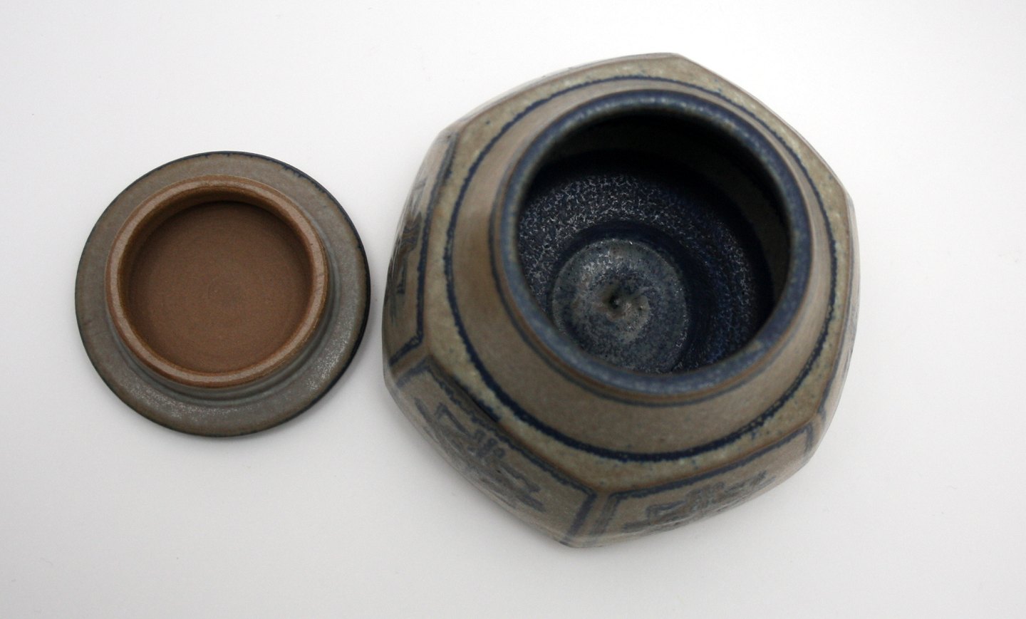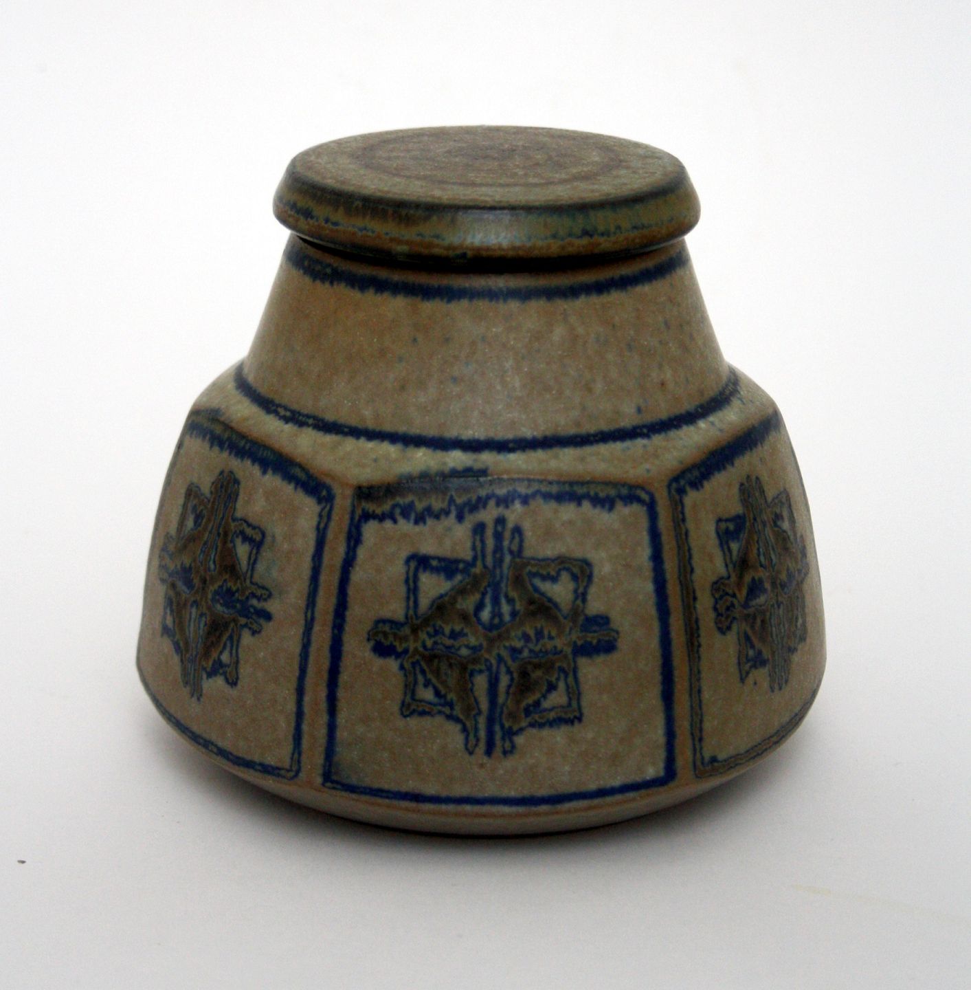 Michael Andersen, Bornholm, Krukke med låg designet af Marianne Starck. Højde 12 cm. Øverste diameter 8 cm. Flot stand. Pris: SOLGT
