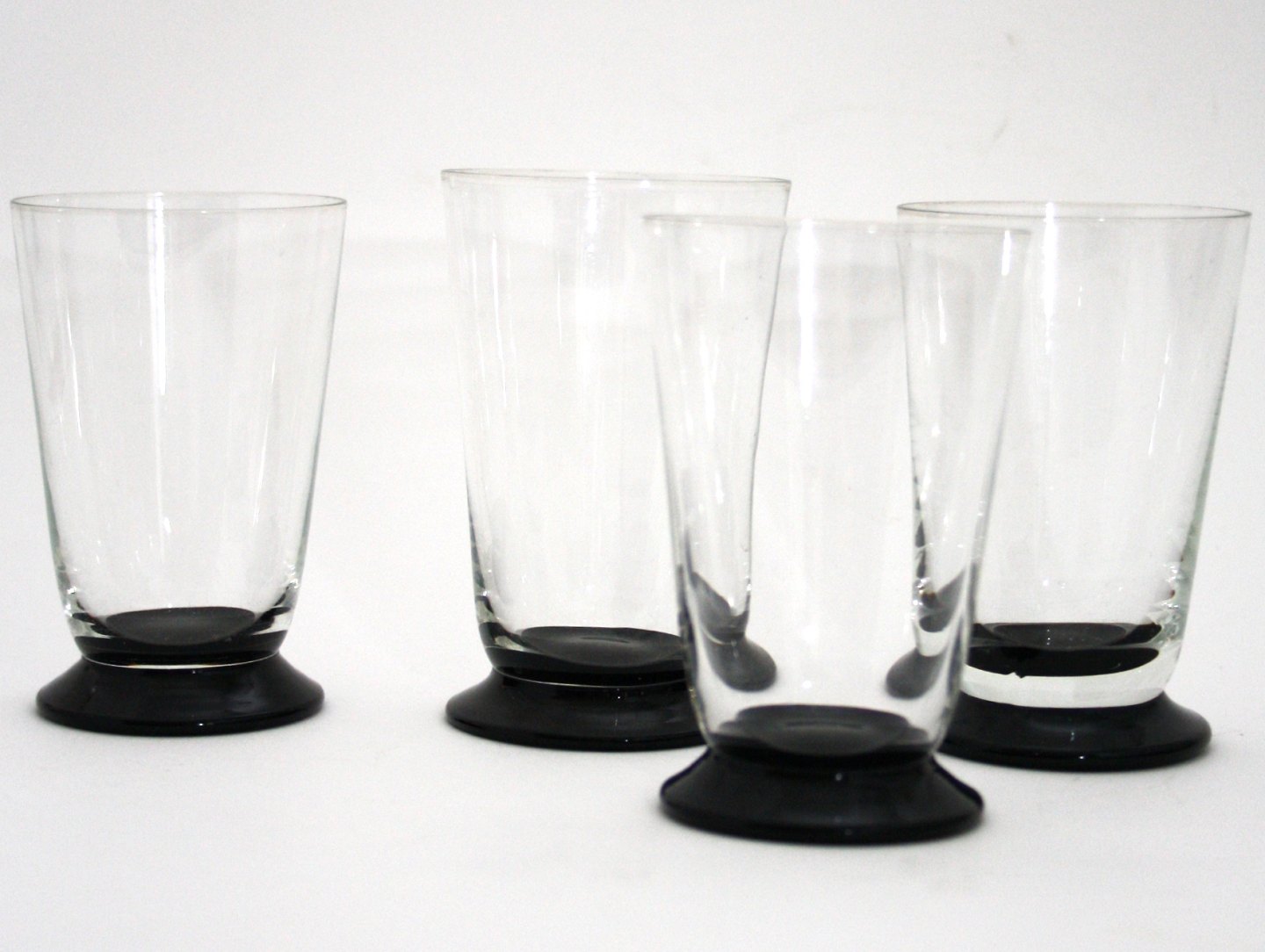 Sodavandsglas med sort fod. Højde 8,5 cm. Øverste diameter 5,7 cm. Pris: 60 kr. stk. Lager: 7