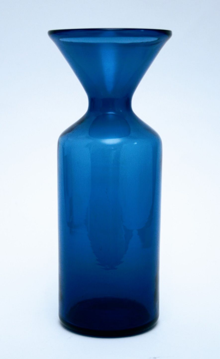 Kastrup/Holmegaard, Capri serien i blåt glas, designet af Jacob E Bang i 1961. Vase. Højde 22,5 cm. Øverste diameter 9 cm. Flot stand. Pris: SOLGT