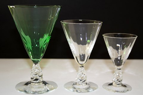 Holmegaard, klar kantineflaske med opalhvid emaljedekoration med teksten "Snaps" med original træprop. Designet af Jacob E Bang, i 1937. Flaske. Højde 21,5 cm. Pris: SOLGT Små glas. Højde 5,5 cm. Pris: SOLGT