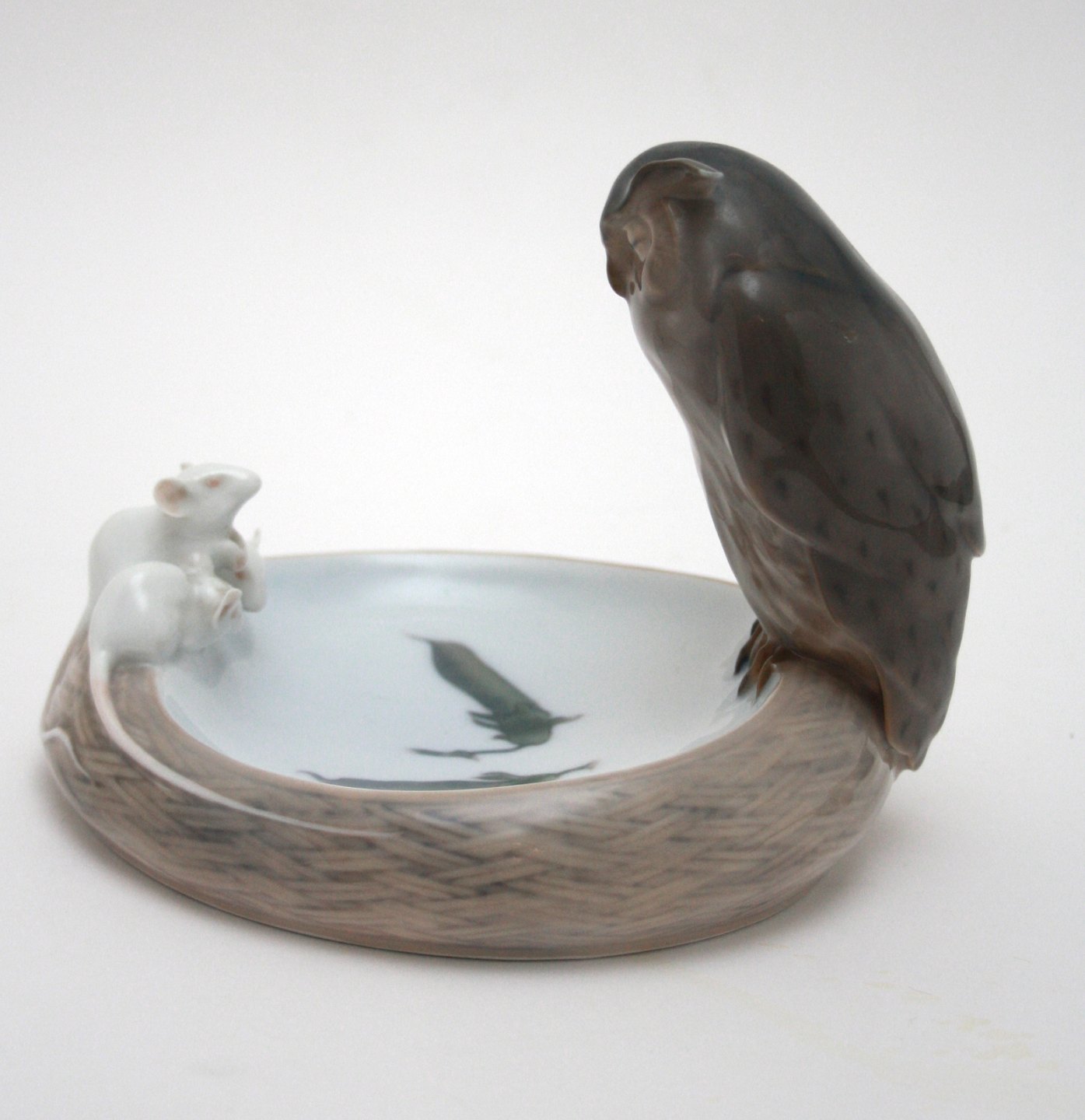 Royal Copenhagen, Ugle og tre mus på fad/skål. Designet af Chr. Thomsen i 1904. Højde 13 cm. Længde 14,5 cm. Der er afslag på det ene museøre. I. sortering. Pris: SOLGT