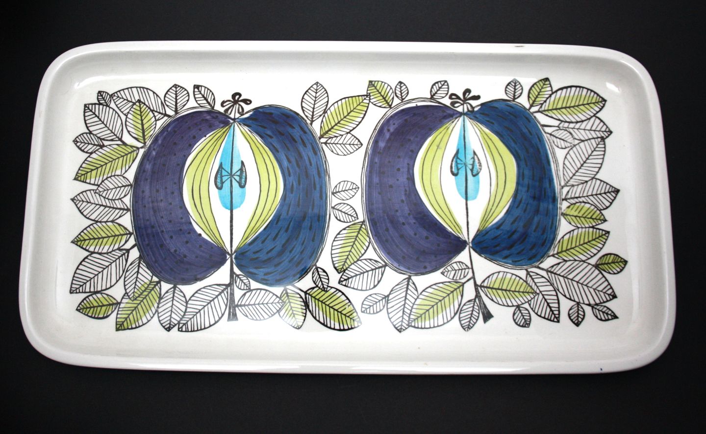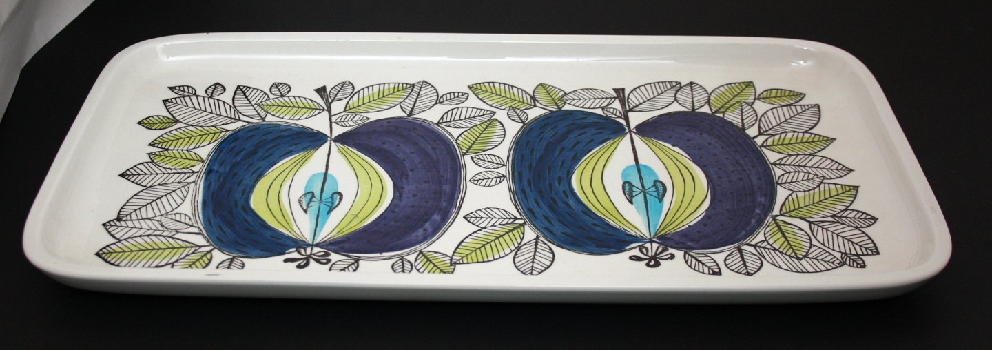 Rørstrand, Sweden, Eden, Aflangt fad med halve æbler. Designet af Sigrid Richter i starten af 1960'erne. Formnr. 33. Længde 42,5 cm. Bredde 22,5 cm. Højde 2,8 cm. Flot stand med lidt sort på den ene kant. Pris: SOLGT