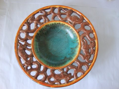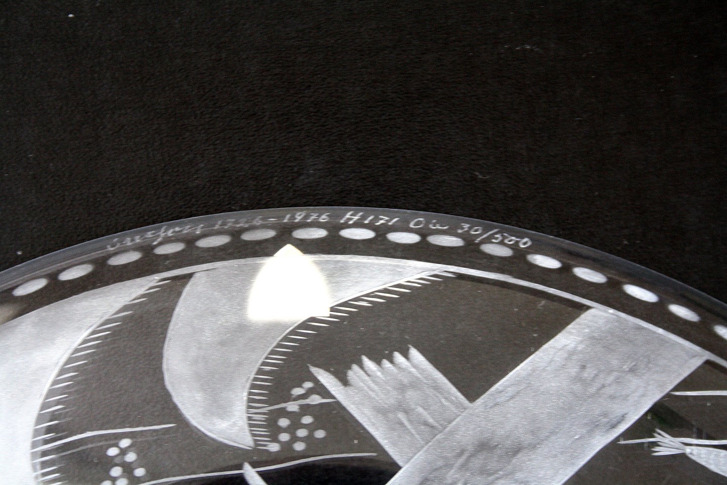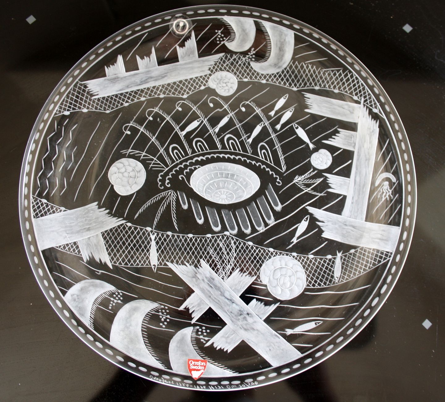 Orrefors, Den sönderslagna bryggan fra 1920 fortælling om Edward Halds skærgårdssommer. Originalen findes på Sveriges Nationalmuseum. Dette fad er signeret og fremstillet i forbindelse med Orrefors' 250 års jubilæum fra 1726-1976. Fadet er nr. 30 ud af 500 eksemplarer. Diameter 27,5 cm. Pris: SOLGT