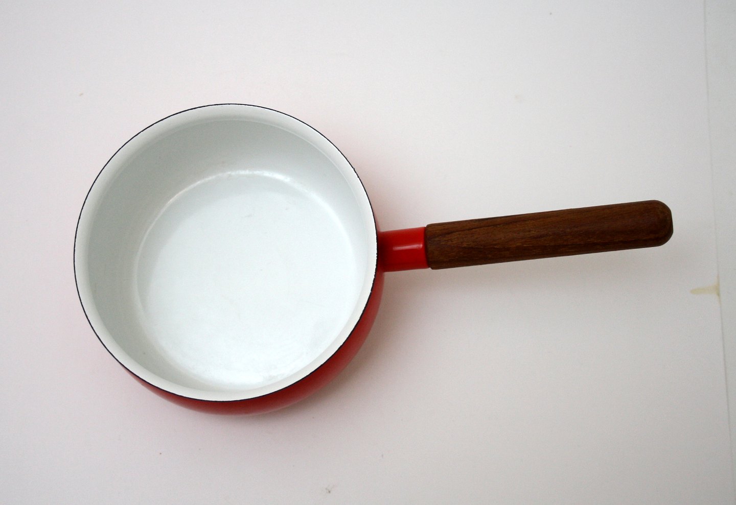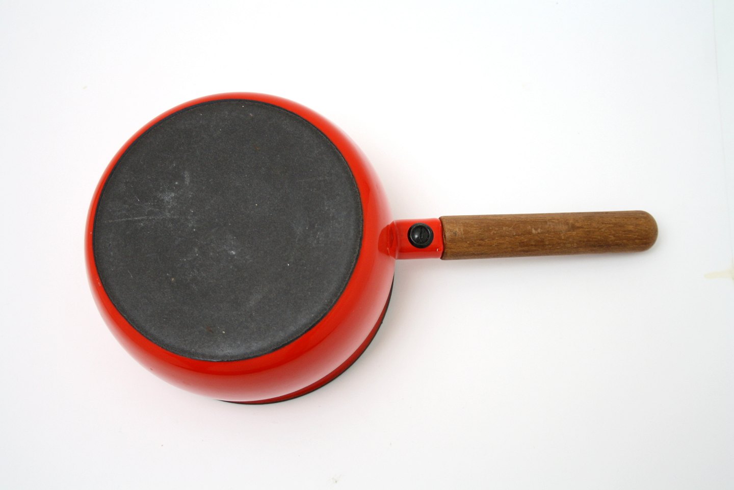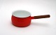 Arabia, Wärtsilä, Rød emaljekasserolle med træskaft designet af Kaj Franck (1911-1989). Højde 7 cm. Diameter 12,5 cm. Længde 24,5 cm. Flot stand. Pris: SOLGT