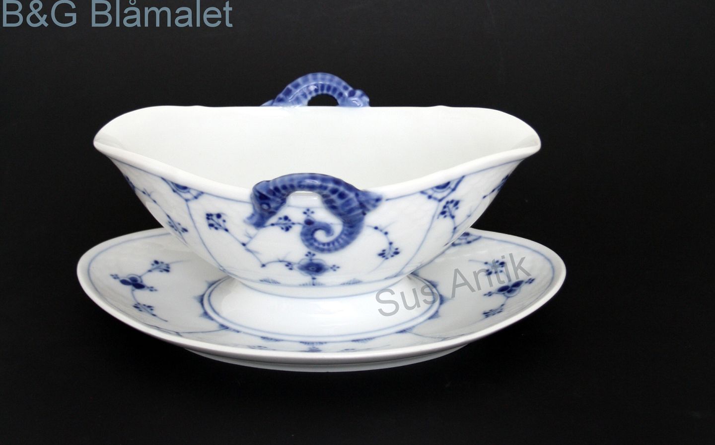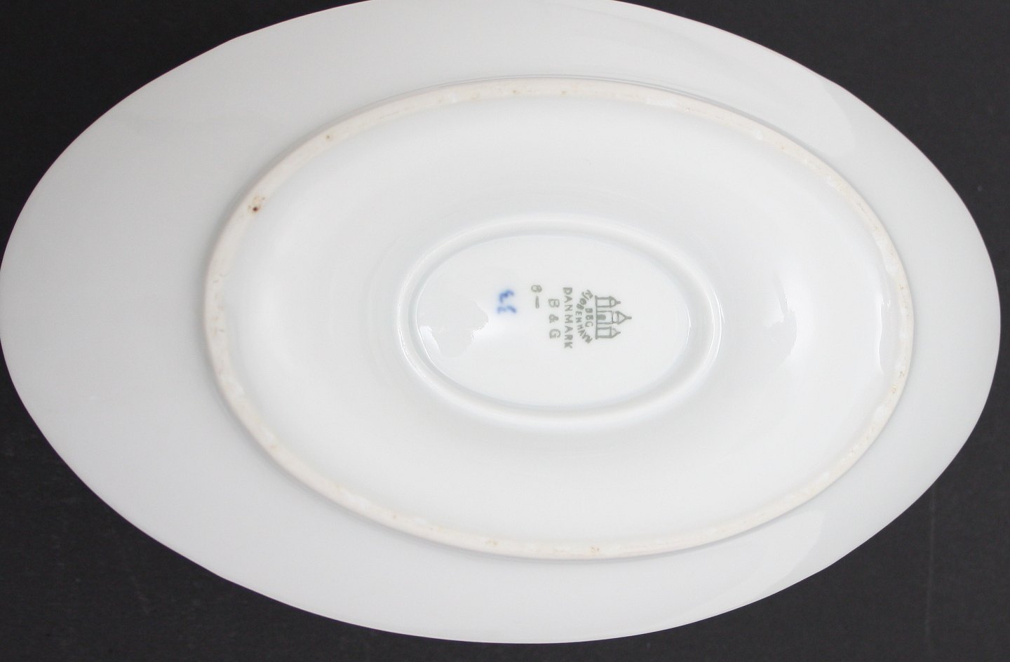 Bing og Grøndahl, Blåmalet (Musselmalet). Sovseskål. Nr. 8. Produceret 1948-1952. Længde 23 cm. Højde 11 cm. II. sortering. Brændingspletter på underfadet, fin stand. Pris: SOLGT