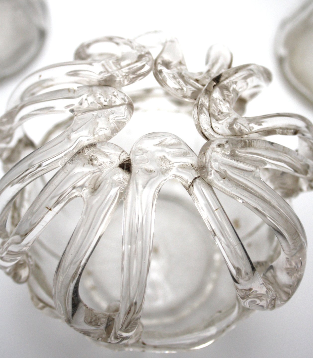 Diverse glasværk, betegnet som fusk, Brudekroner. T.v. Flad top. Højde 23,5 cm. Pris: SOLGT T.v. Rund top. Højde 24,5 cm. Pris: SOLGT Skål. Højde 13 cm. Revne se foto. Pris: SOLGT