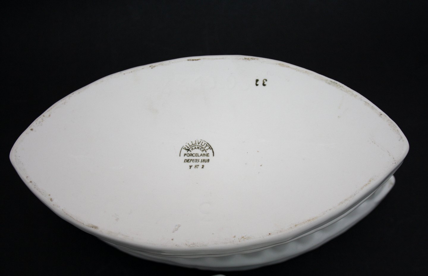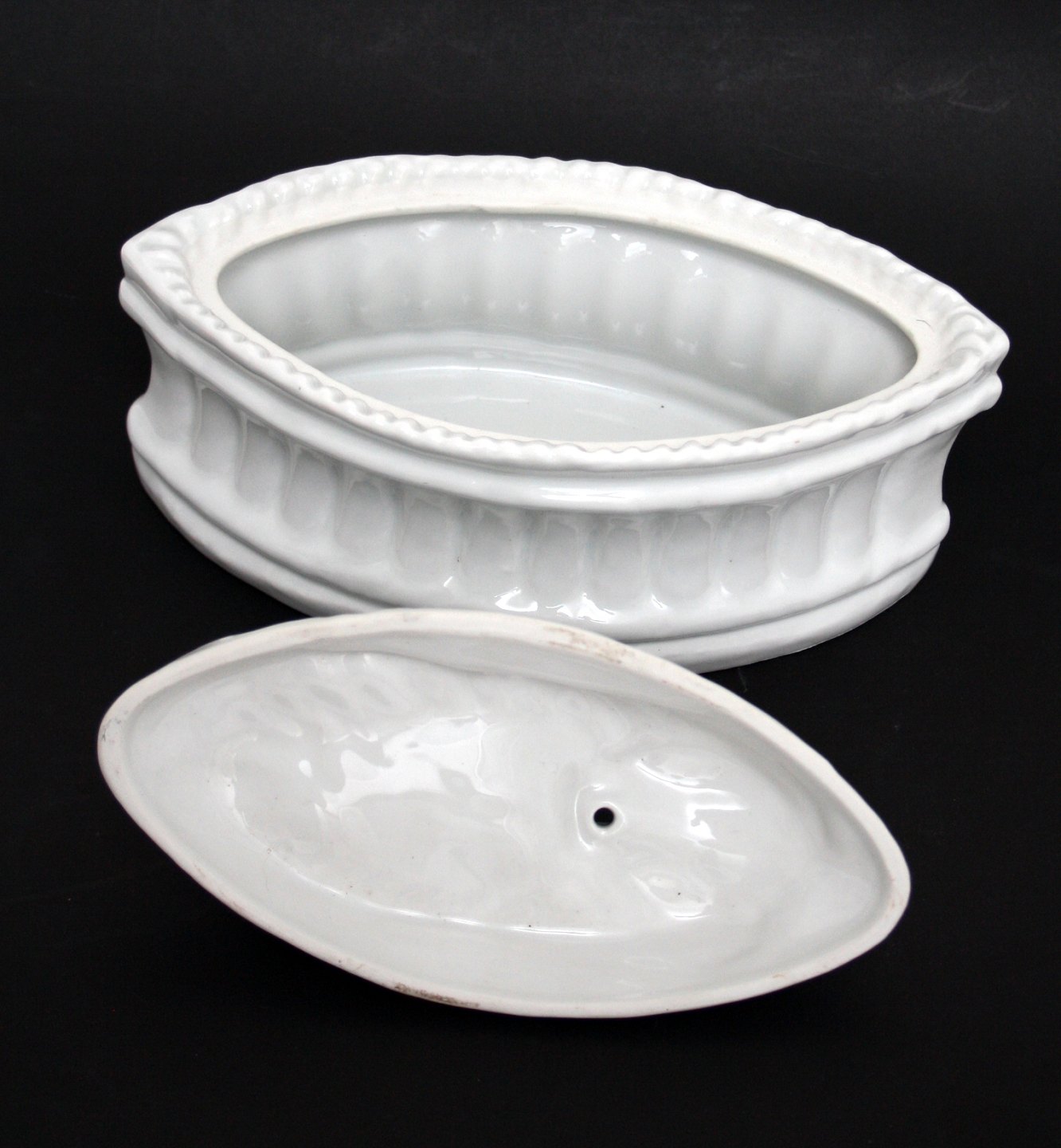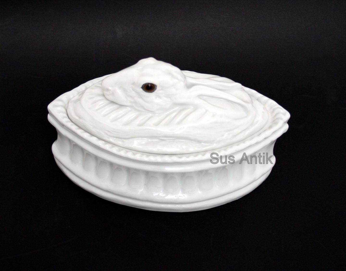 Pillivuyt, France, Vildt patéterrin med hare. Fra 1. halvdel af 1900 tallet. Formnr. 431995-3. Længde 23 cm. Bredde 11,5 cm. Højde 14 cm. Sjælden, fin stand. Pris: SOLGT