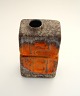 Strehla, West Germany. Firkantet vase i brunmeleret mat glasur med relief mønster og orange glasur. Højde 21 cm. 10 x 7 cm. Pris: SOLGT