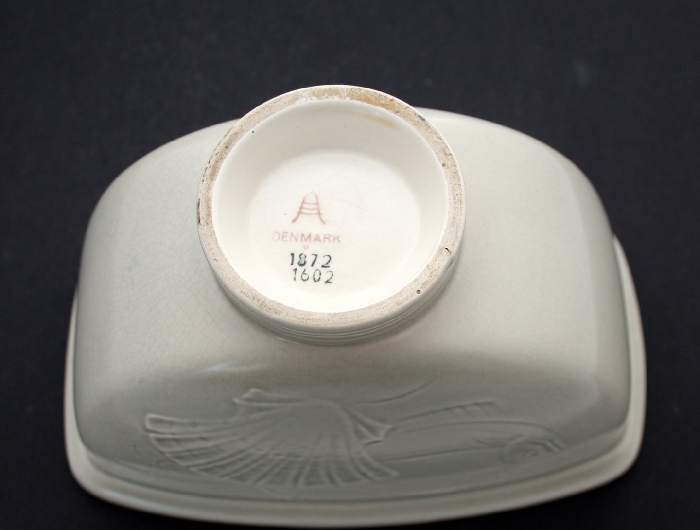Oval skål i creme mat glasur med fiskemotiv. Nr. 1872/1602. Højde 10 cm. 17 x 10 cm. Pris: 350 kr.