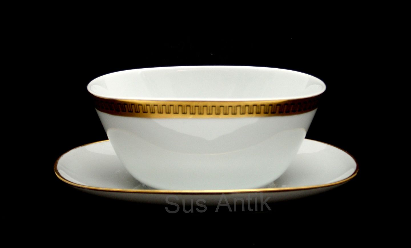 Lyngby, Danmark, Trend 450. Hvidt stel med græsk guldbort. Sovseskål. Højde 7 cm. Længde 18 cm. Pris: SOLGT