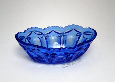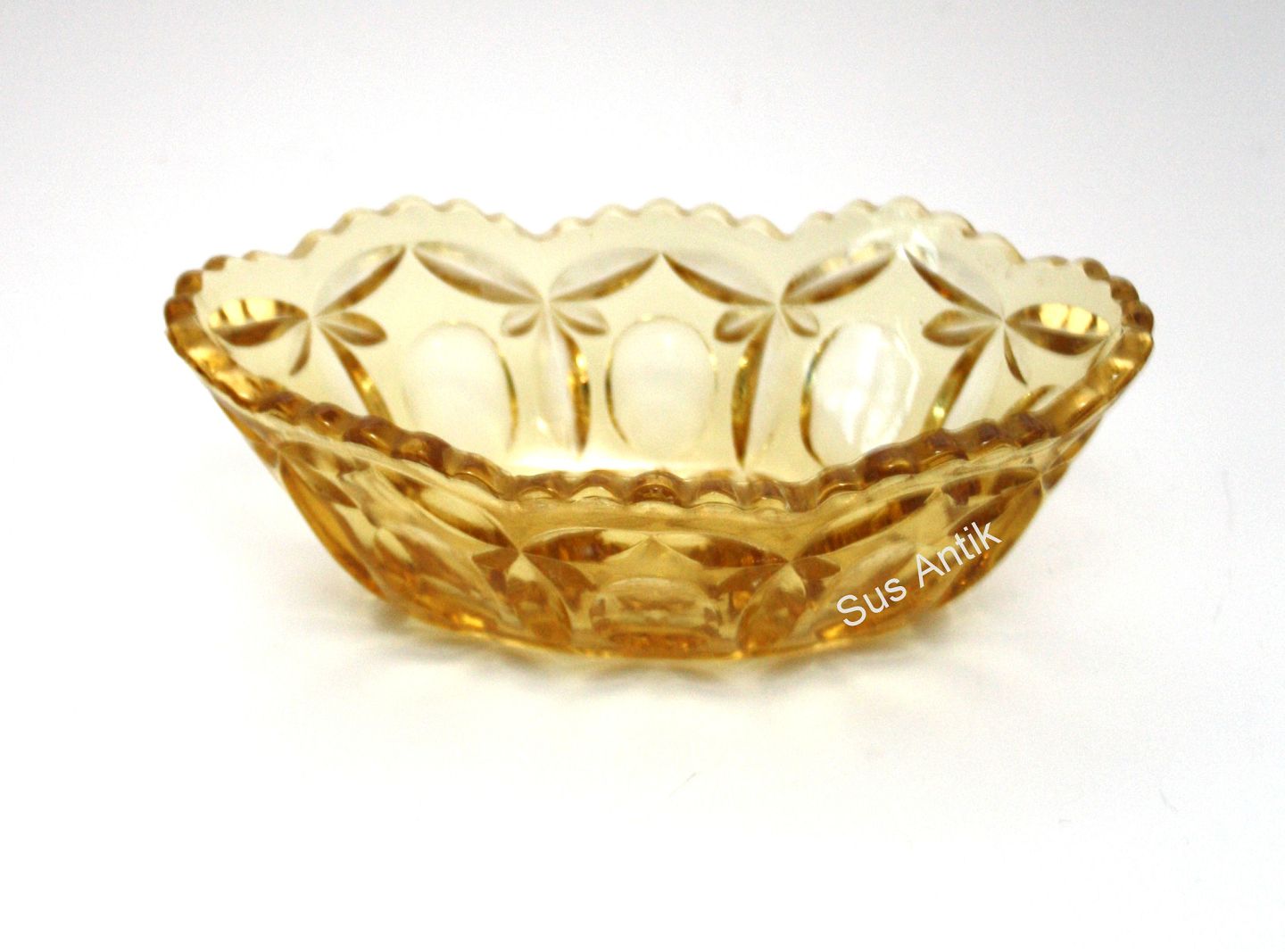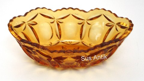 Fyens Glasværk, Rolf lysegul presset glas. Produceret fra 1934 og frem. Jardiniere (oval skål). Længde 18 cm. Bredde 10 cm. Højde 6 cm. Pris: 150 kr. stk. Lager: 2