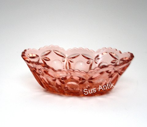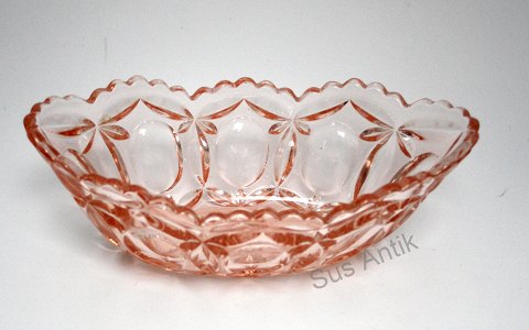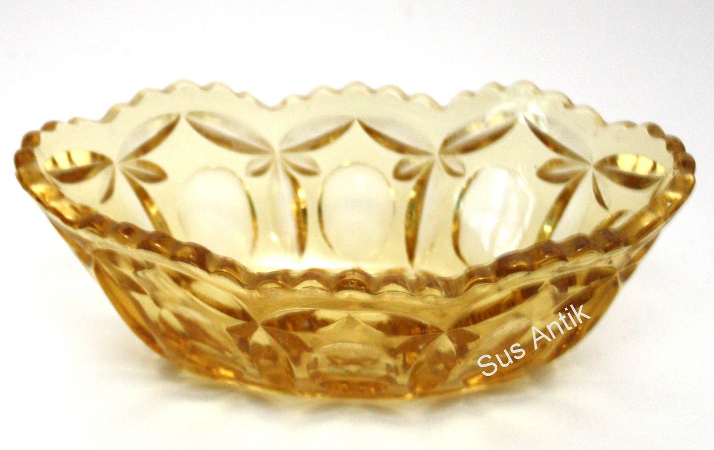 Fyens Glasværk, Rolf lysegul presset glas. Produceret fra 1934 og frem. Jardiniere (oval skål). Længde 23 cm. Bredde 13 cm. Højde 9 cm. Pris: 275 kr. stk. Lager: 2