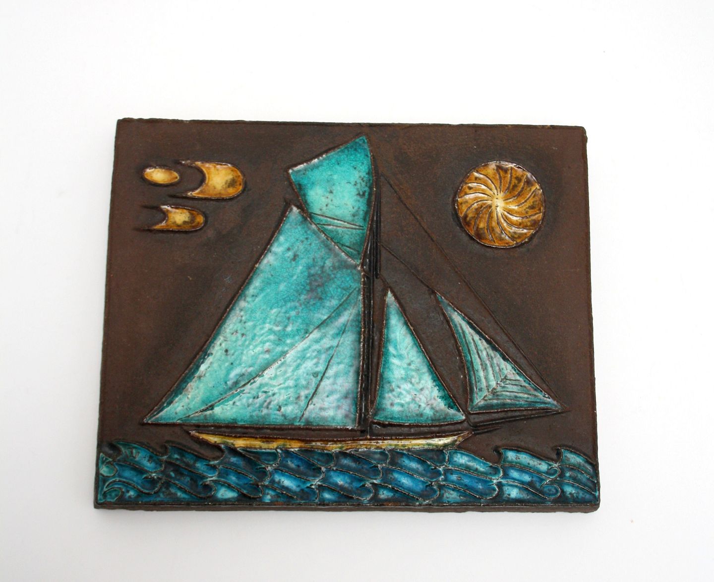 Knabstrup, Relief med sejlskib. Designet af Waltraud T-Praschak. Minimale småafslag på kant. Længde 23 cm. Højde 18,5 cm. Pris: SOLGT