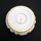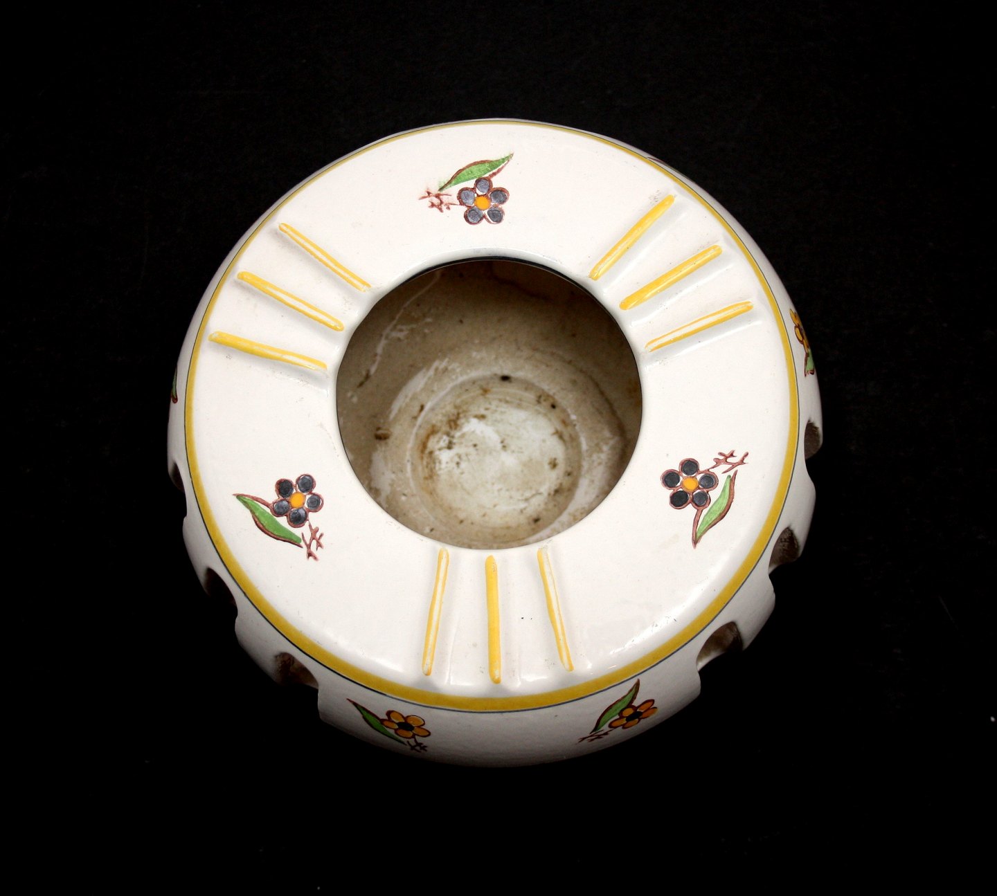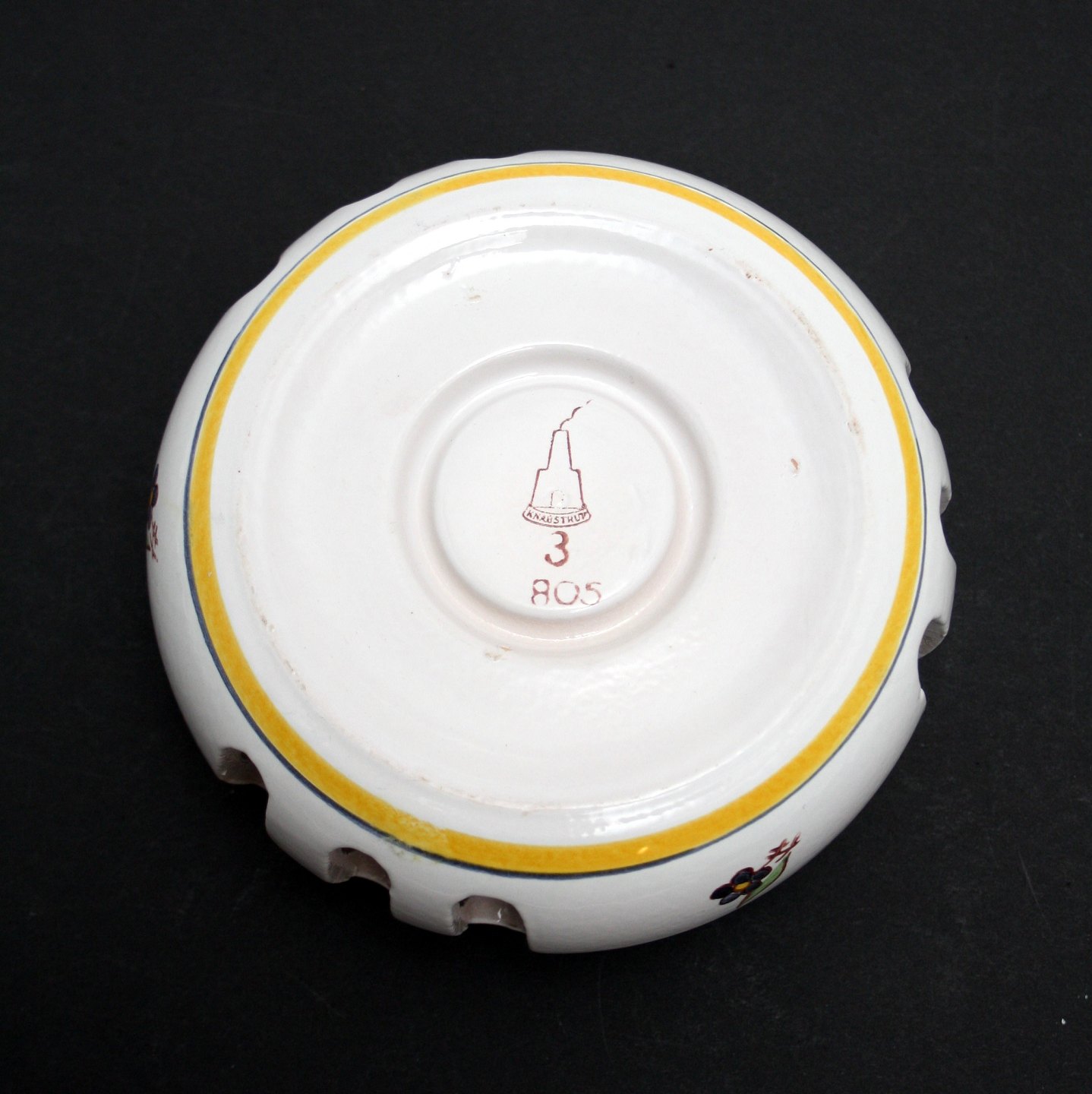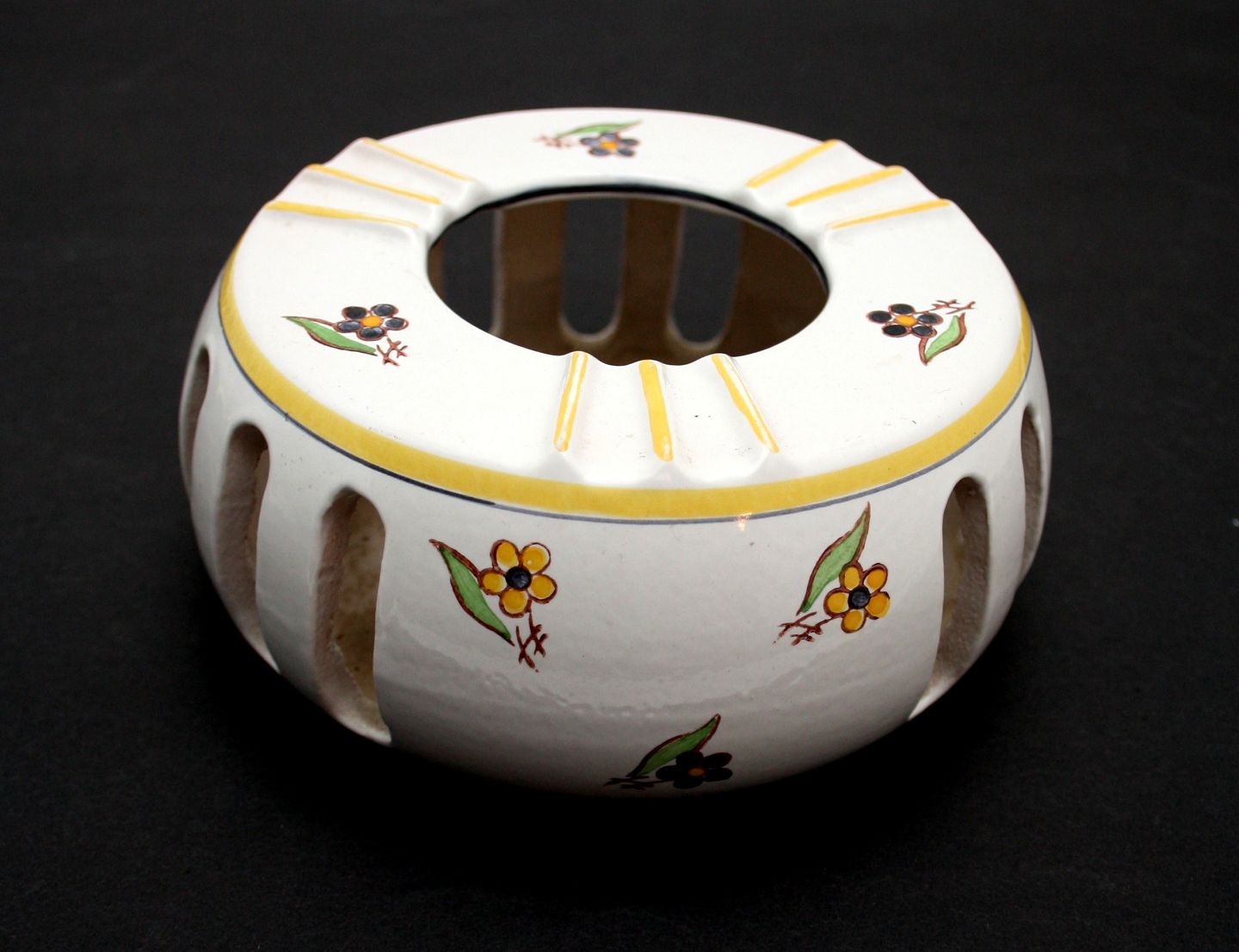 Knabstrup, Birte. Testel det første navngive testel fra 1942 opkaldt efter Knabstrups direktør Frida Schous niece. Stellet er i majolica med håndmalede små strøblomster i gule og blå nuancer. Fyrfad til tekande nr. 3/805. Højde 6,5 cm. Diameter ca. 15 cm. Fin stand. Pris: SOLGT