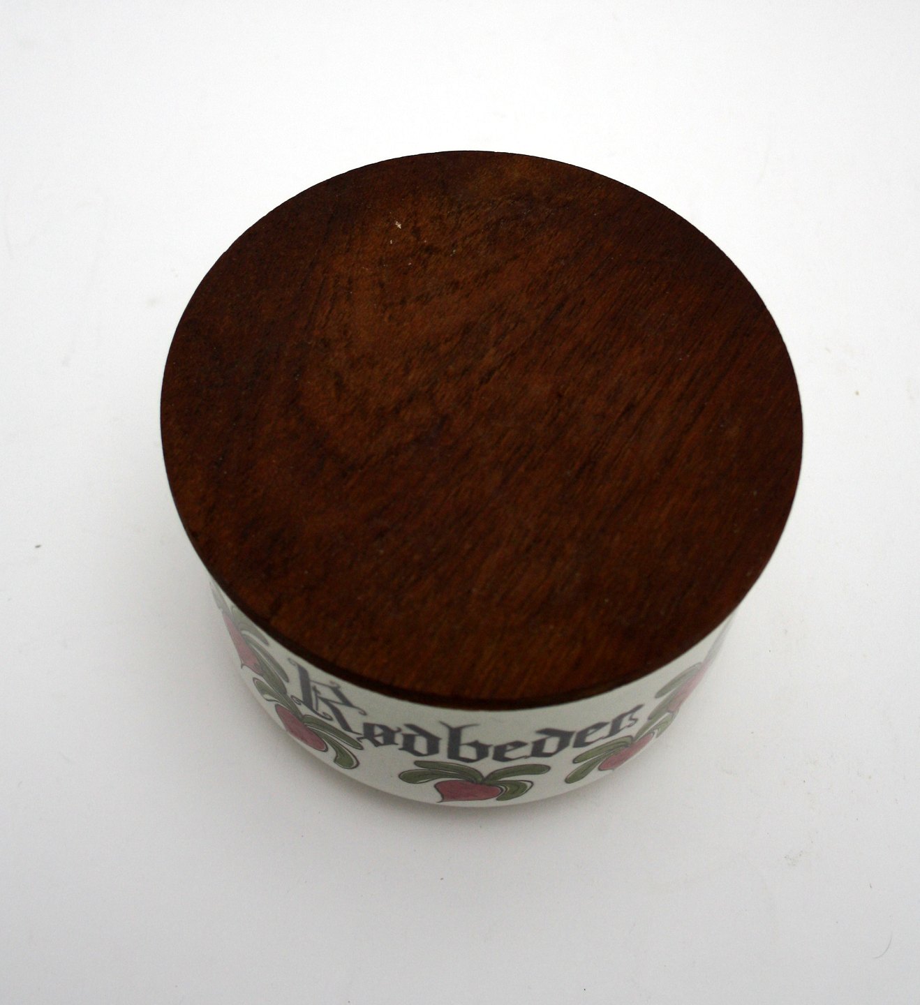 Rødbeder med låg (lav). Låget er lysere end på foto. Højde 8,5 cm. Diameter 13 cm. Få overfladekrakeleringer. Pris: 125 kr. stk. Lager: 1