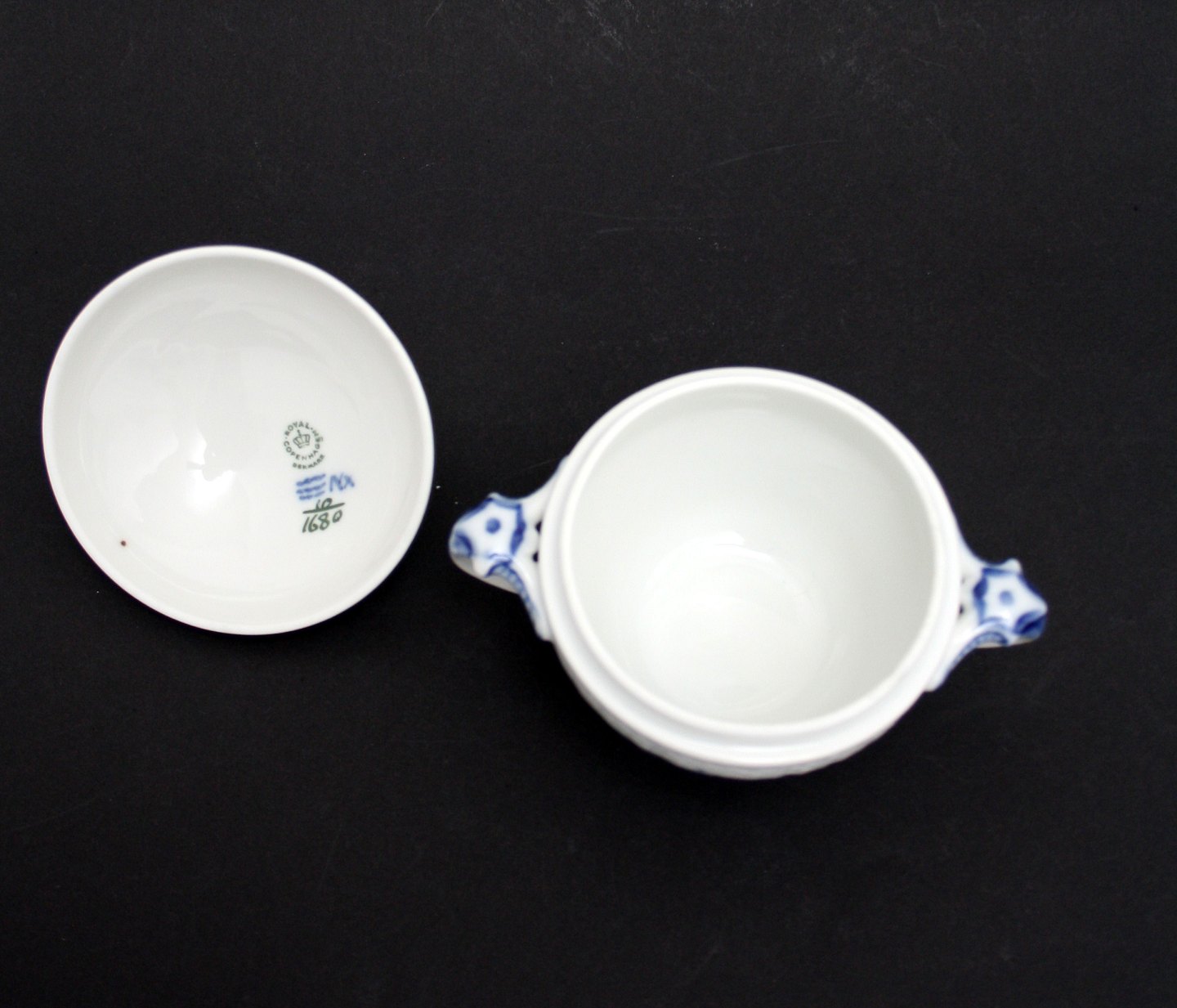 Royal Copenhagen, Blå Blomst svejfet, Lille sukkerskål med låg. Nr. 10/1680. Højde 11 cm. Længde 14 cm. III. sortering medarbejdersortering fin stand. Pris: SOLGT