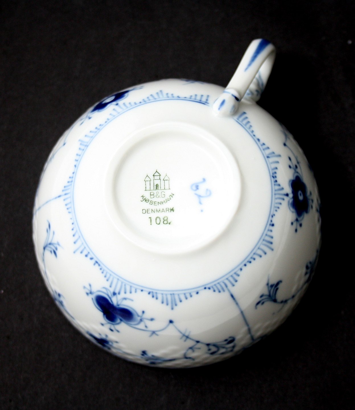 Bing og Grøndahl, Blåmalet (Musselmalet). Tekop med underkop. Nr. 108. Produceret fra 1962-1970. Højde 4,7 cm. Diameter 10 cm. II. sortering. Perfekt stand. Pris: SOLGT