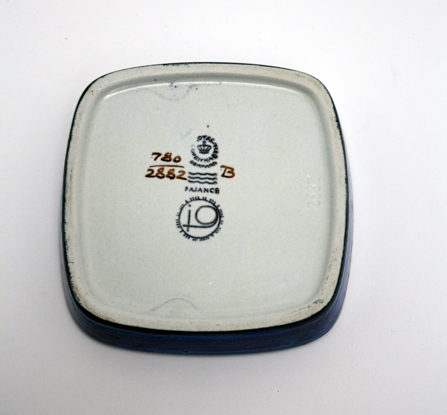 Royal Copenhagen, Baca Kunstfajance, Blåt fad/skål. Designet af Jonna Gerber. Nr. 780-2882. 11 x 11 cm. Højde ca. 2,5 cm. Arkivfoto. Denne er III. sortering (medarbejdersortering). Pris: 175 kr. stk. Lager: 1