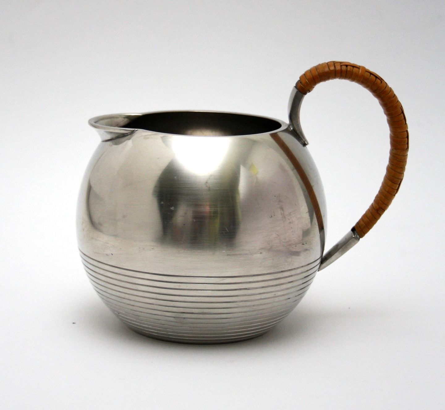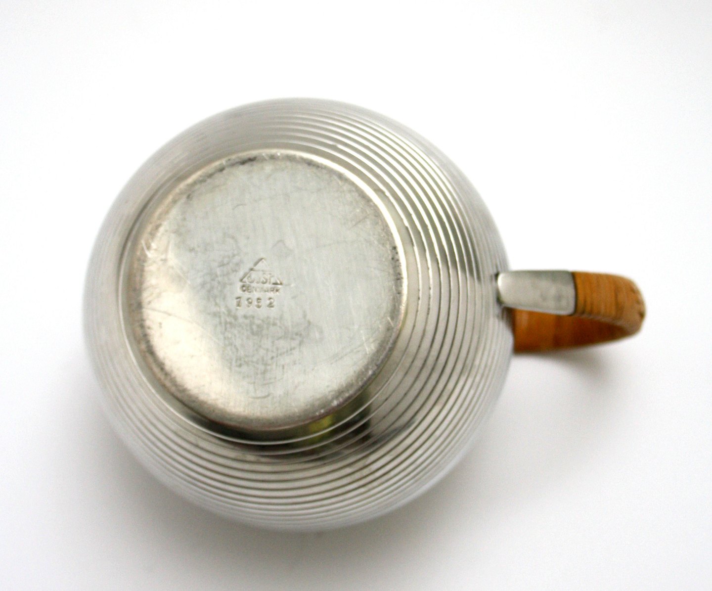 Just Andersen, Kande med basthank og riller i poleret tin. Just A Denmark 1952. Højde 12,5 cm. Længde 15 cm. Fin stand med enkelte overfladeridser. Pris: SOLGT