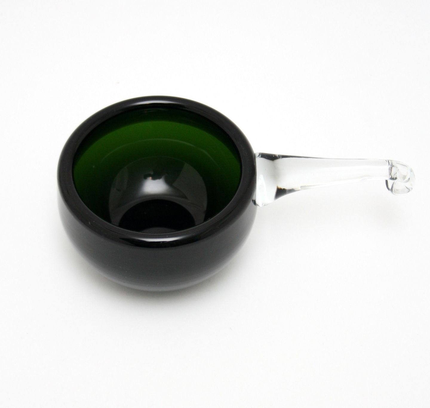Holmegaard/Fyens glasværk, Palet sildeskål grøn transparent glas med klar hank. Designet af Michael Bang. Tilgår Paletserien i 1976 og udgår samme år, derfor sjælden. Højde 5,5 cm. Diameter 9 cm. Længde 16,5 cm. Pris SOLGT