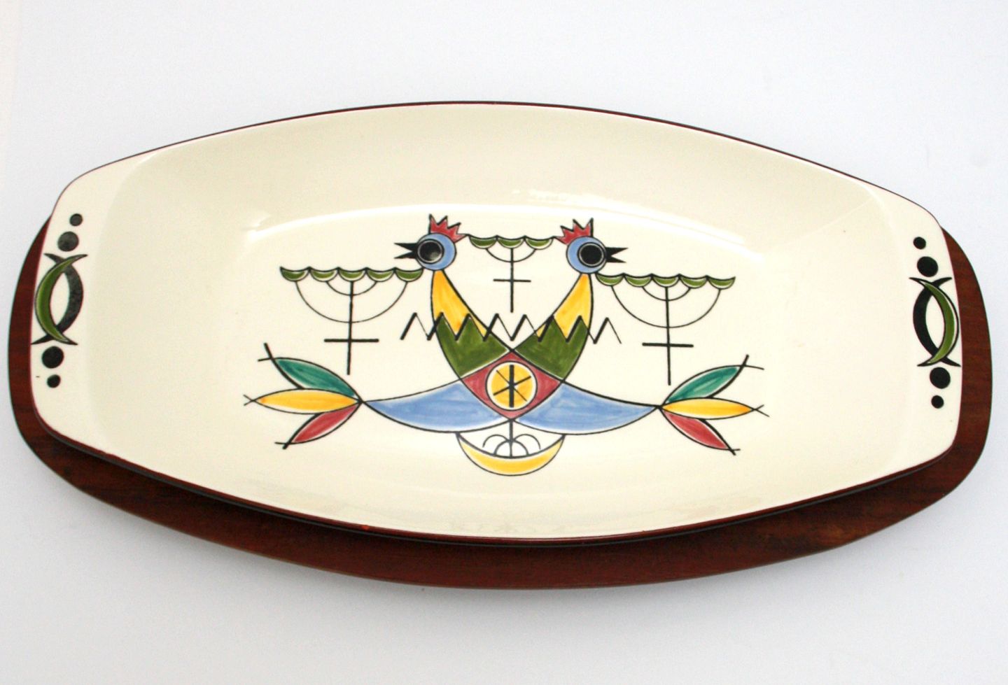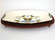 Knabstrup, Symfoni designet af Piotr Baro, formgivet af Johannes Hansen. I produktion i perioden 1959-61. Aflangt fad med fuglemotiv på teak stativ.