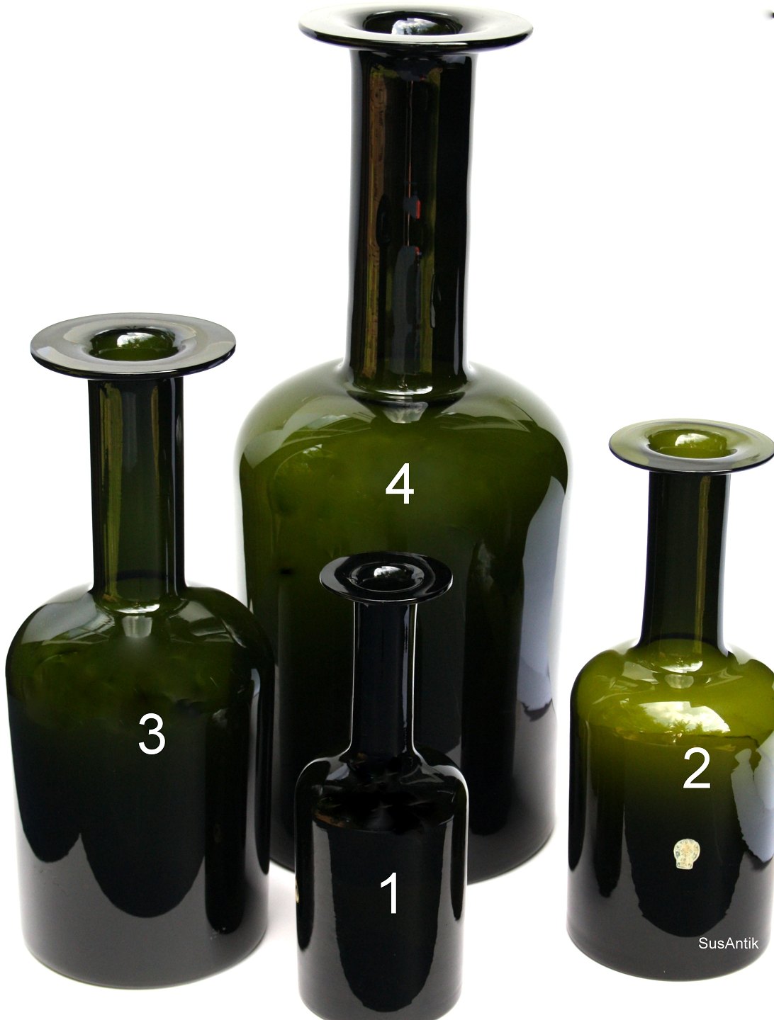 Kastrup-Holmegaard Glasværk, Lille flaskegrøn gulvvase, nr. 1 på ekstrafoto. Højde 25,5 cm. Designer Otto Brauer 1959. Almindelig brugsspor. Pris: SOLGT