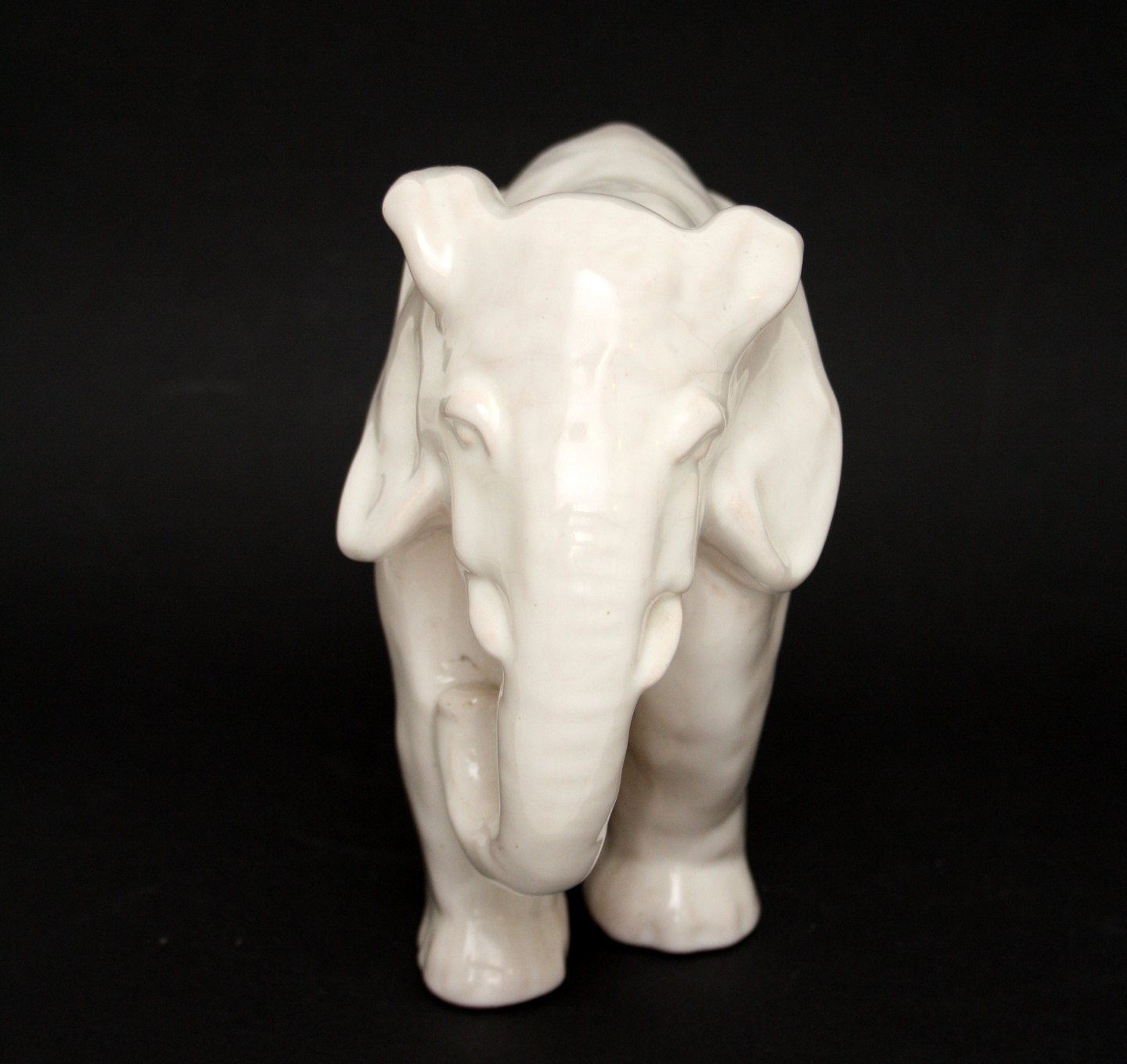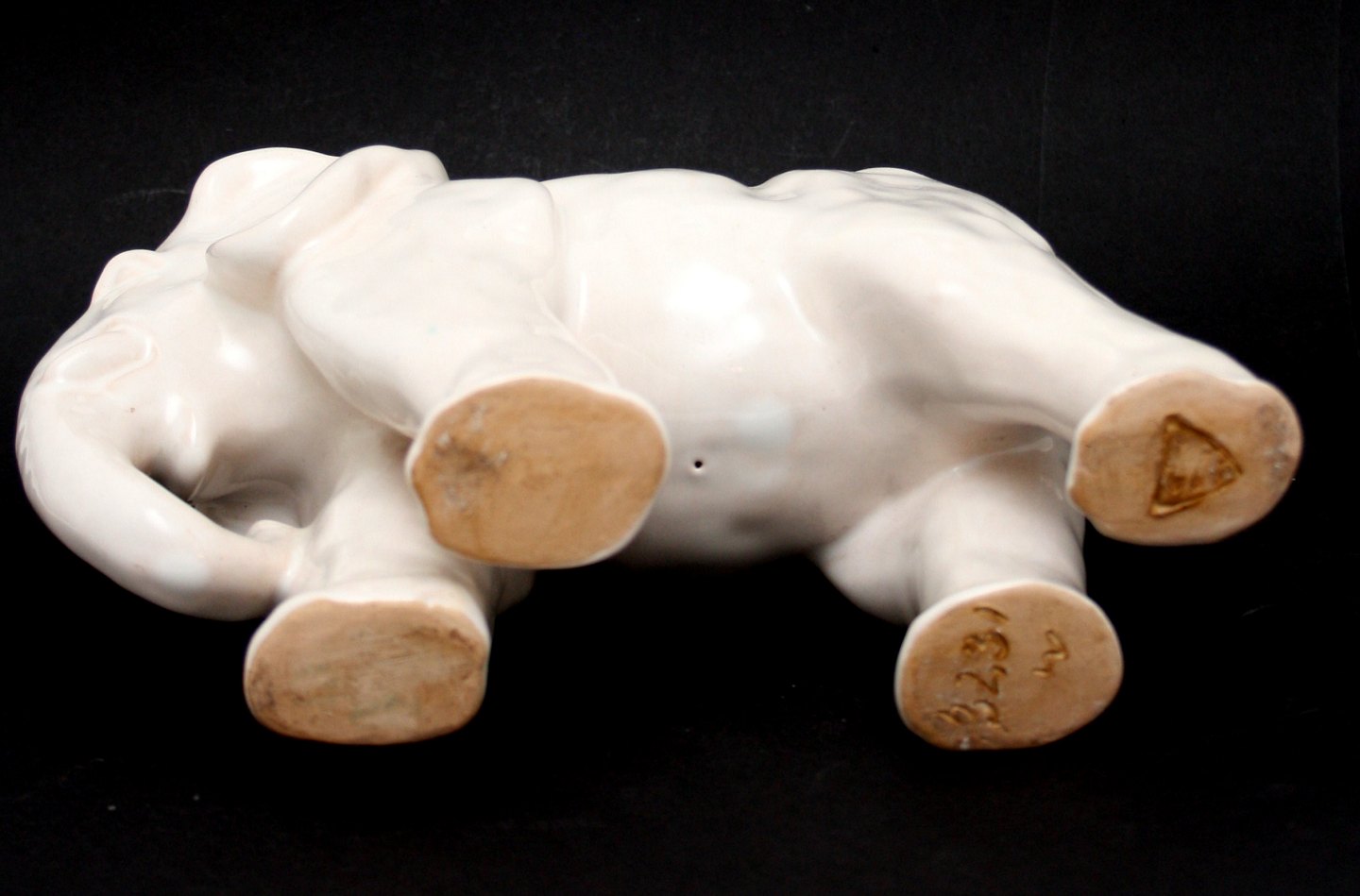 Michael Andersen og & Søn, Bornholm, Hvidglaseret elefant. Nr. 3231. Højde 16,5 cm. Længde 24 cm. 2 blågrønne glasurpletter og let overfladekrakelering, ellers fin stand. Pris: 1100 kr.