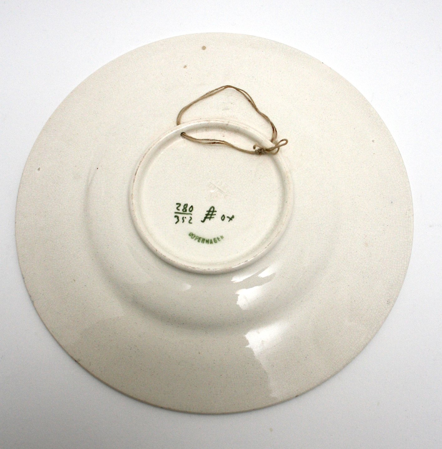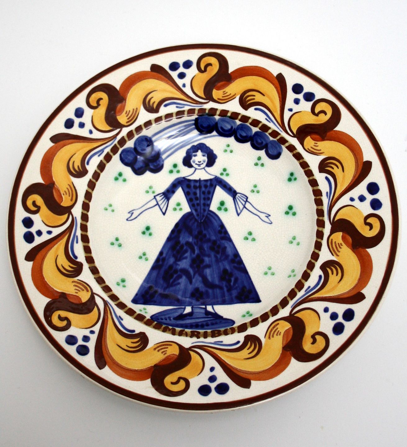 Aluminia, Platte med Maribos byvåben med motiv af kvinde i blåt. Platten er fra skønvirkeperioden i starten af 1900 tallet. Designet af Harald Slott-Møller i 1904. Nr. 280/352. Diameter 25 cm. Lettere små overfladekrakeleringer. Pris: 450 kr.