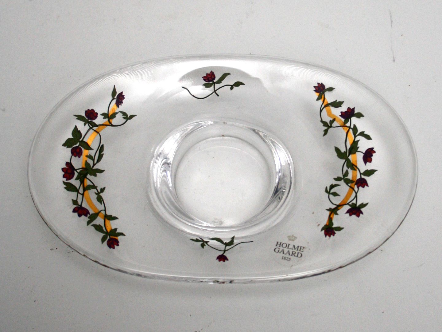 Holmegaard, Golden Christmas kalenderstage 2003, Lilla blomsterranker. Designet af Michael Bang/Peter Svarrer og Jette Frölich. Længde 18,5 cm. Bredde 12 cm. Højde 3,5 cm. Pris: SOLGT