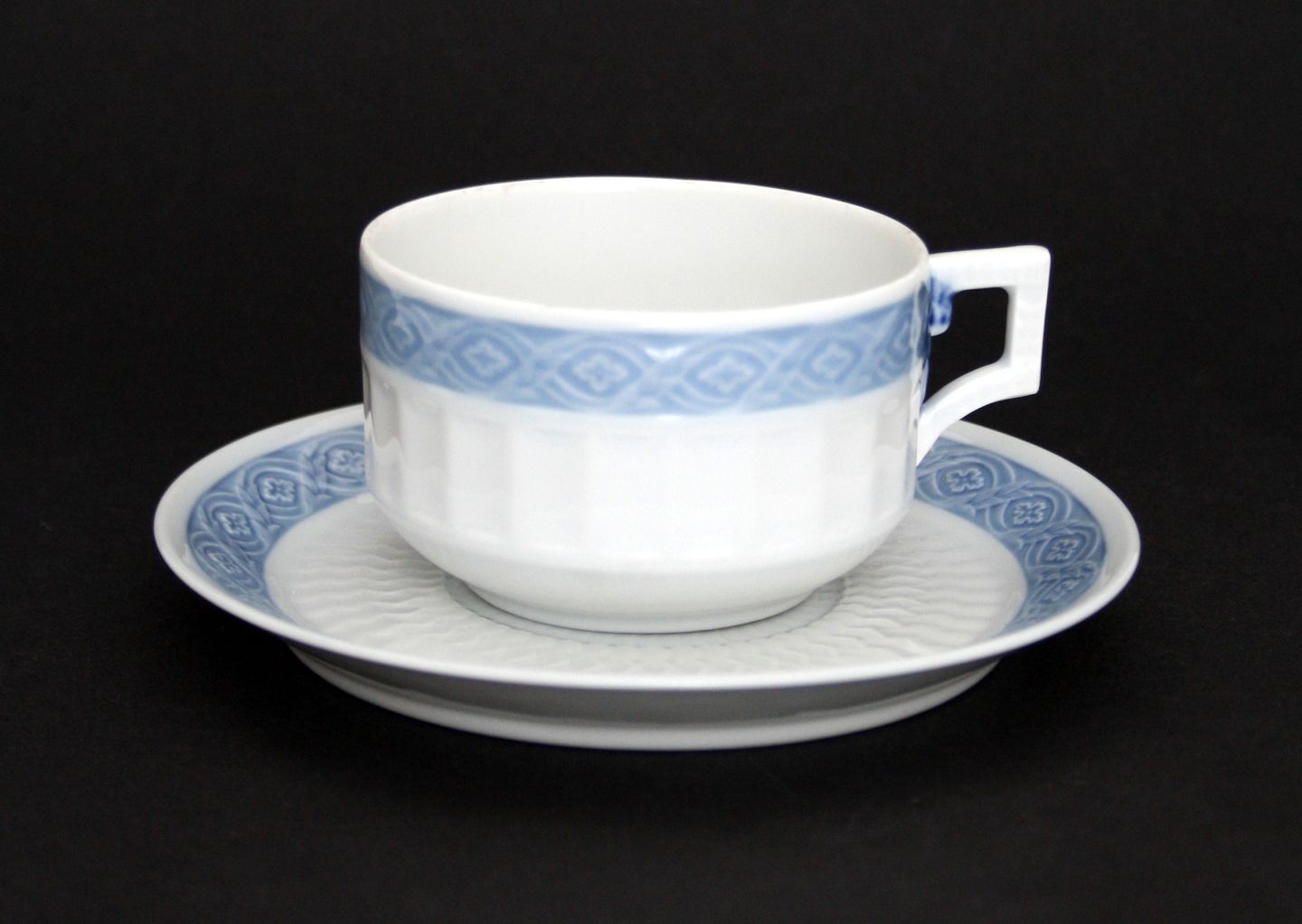 Royal Copenhagen, Blå Vifte. Designet af Arnold Krog i 1909, produceret lige siden. Hvidt porcelænsstel med lyseblå kant. Tekop med underkop.