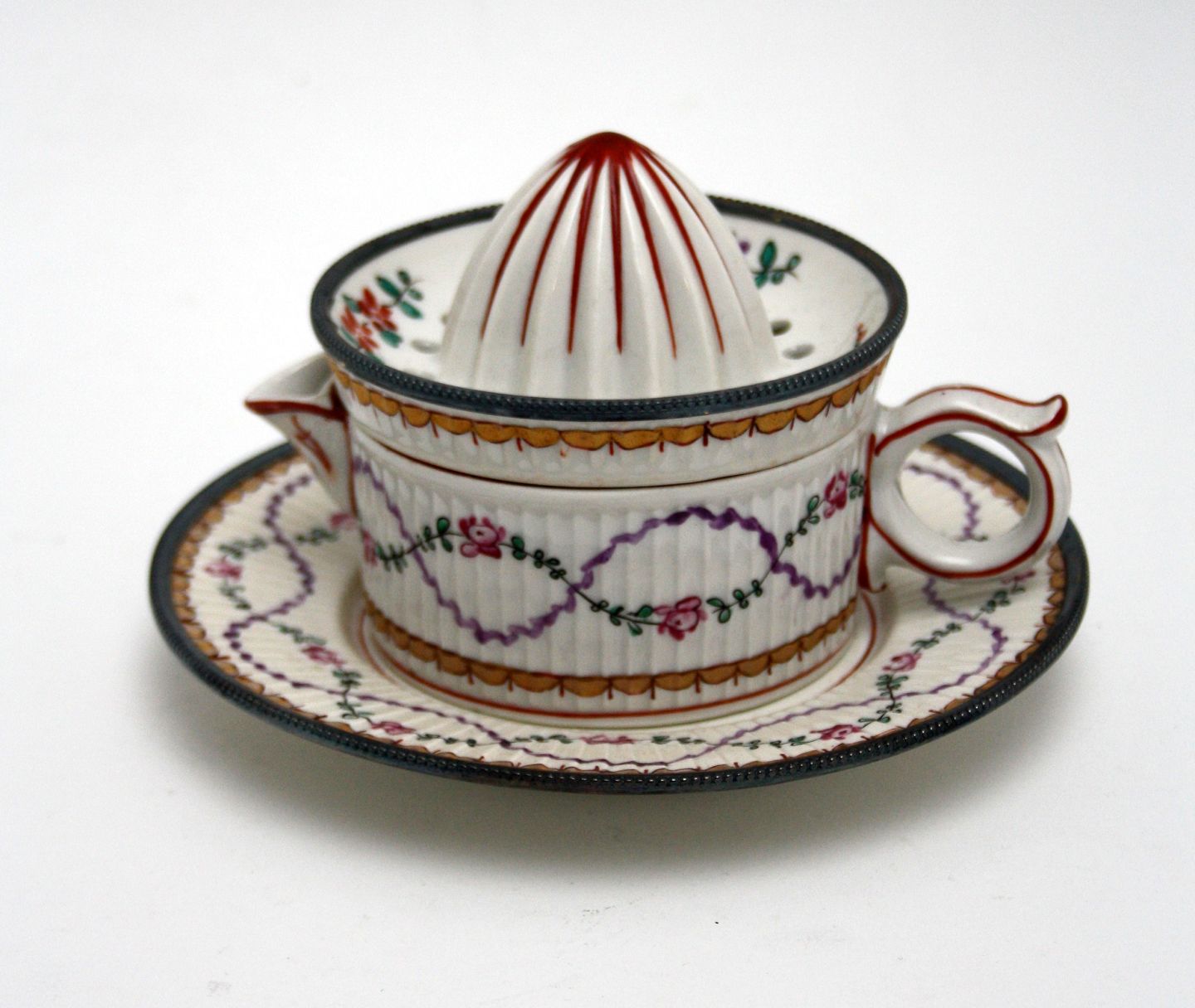 France, Citronpresser i 3 dele. Rillet porcelæn med metalkant. Højde 9,5 cm. Ganske bedårende. God stand. Pris: SOLGT