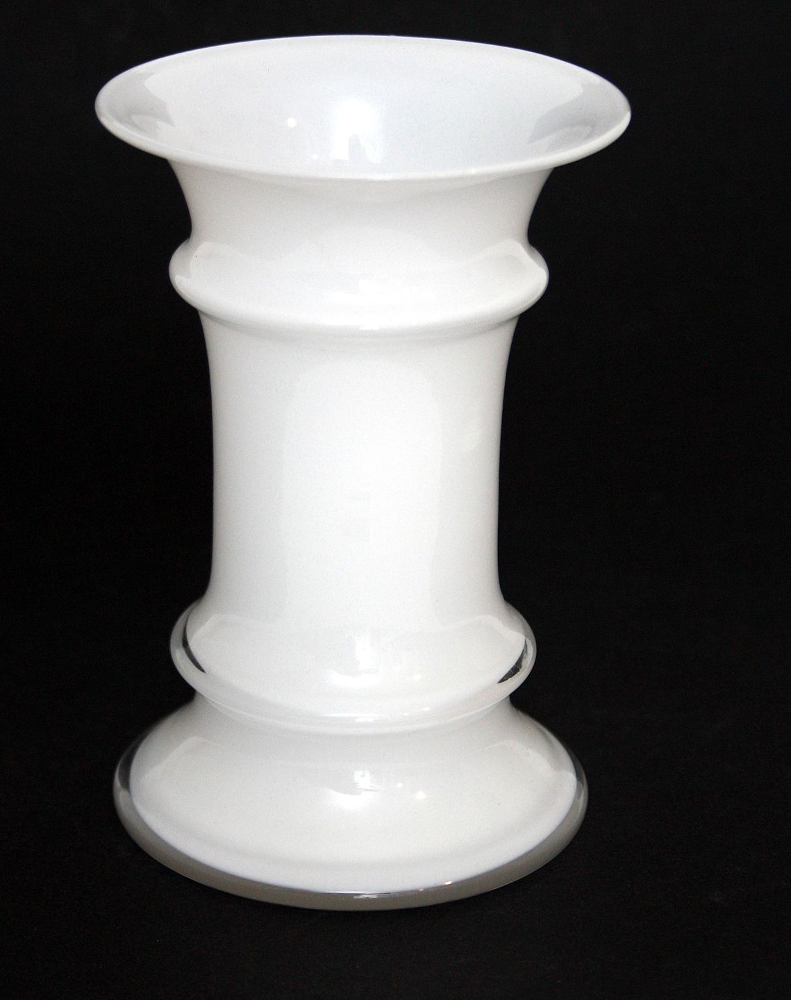 Holmegaard, MB serien designet af Michel Bang i 1981. Mindre vase i formblæst opal hvid glas med klare krystal overfang. Der er ingen signatur i denne serie. Højde ca. 13,5 cm. Øverste diameter 9 cm. Pris: SOLGT
